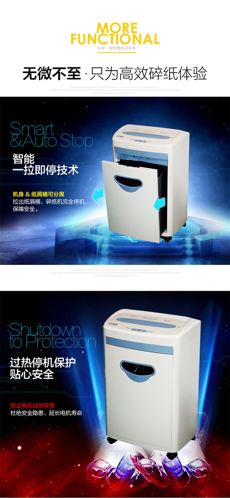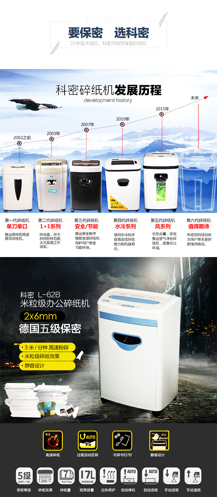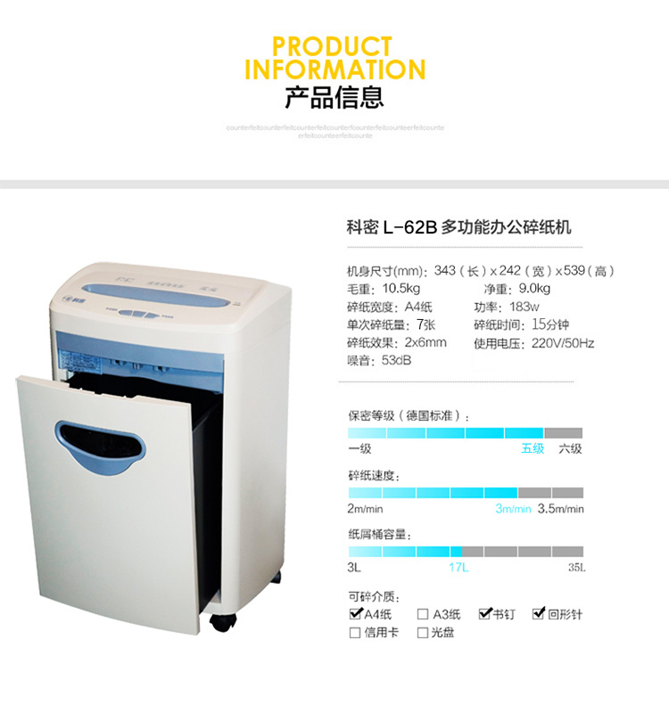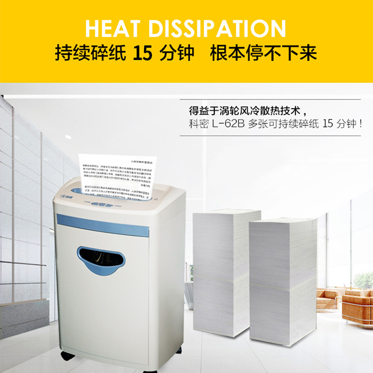 商品属性 [品牌] 科密 [碎纸速度] 2.1-3.0米/分钟 [型号] L-62B [噪音分贝] 50-60dB [入纸宽度] A4纸 [连续粉碎时间(min)] 15分钟 [类型] 碎纸机 [商品单位] 台
