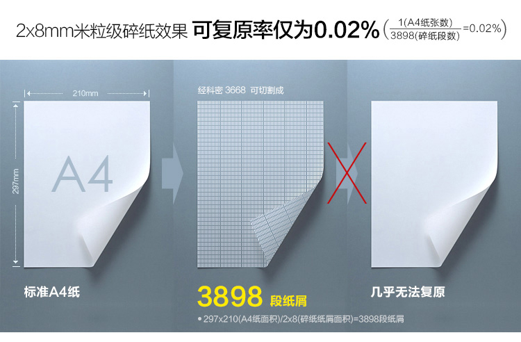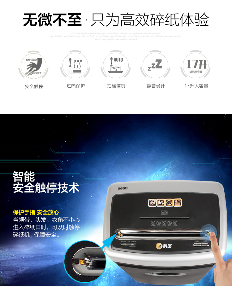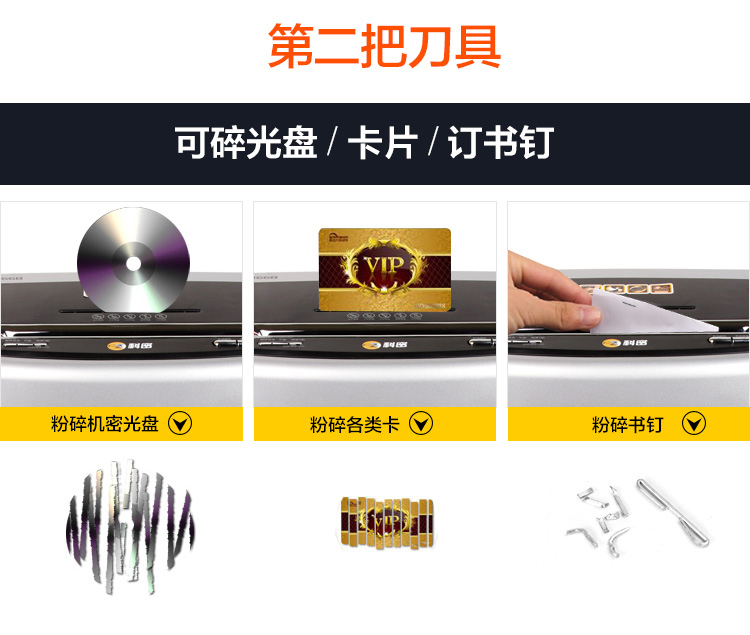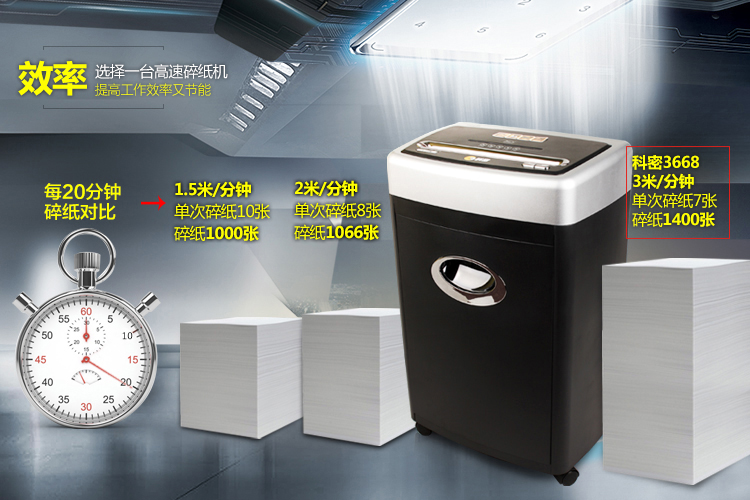 商品属性 [品牌] 科密 [碎纸速度] 2.1-3.0米/分钟 [型号] 3668 [噪音分贝] 50-60dB [入纸宽度] 220mm [尺寸] 343*242*535mm [连续粉碎时间(min)] 21-30分钟 [类型] 碎纸机 [商品单位] 台