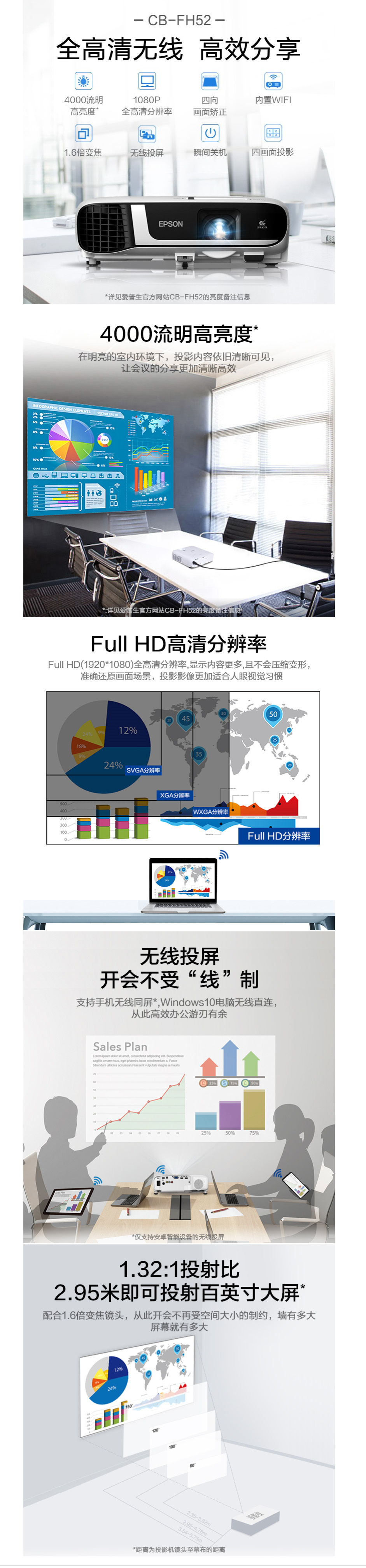 商品属性 [品牌] 爱普生 [参数] 产品类别 商务办公 安装方式 桌上正投;吊装正投;吊装背投 投影光源 灯泡 支持3D格式 不支持 显示技术 3LCD 建议尺寸范围 80-150英寸 操作系统 无智能系统 3D播放 不支持3D功能 [型号] CB-FH52 [商品单位] 台