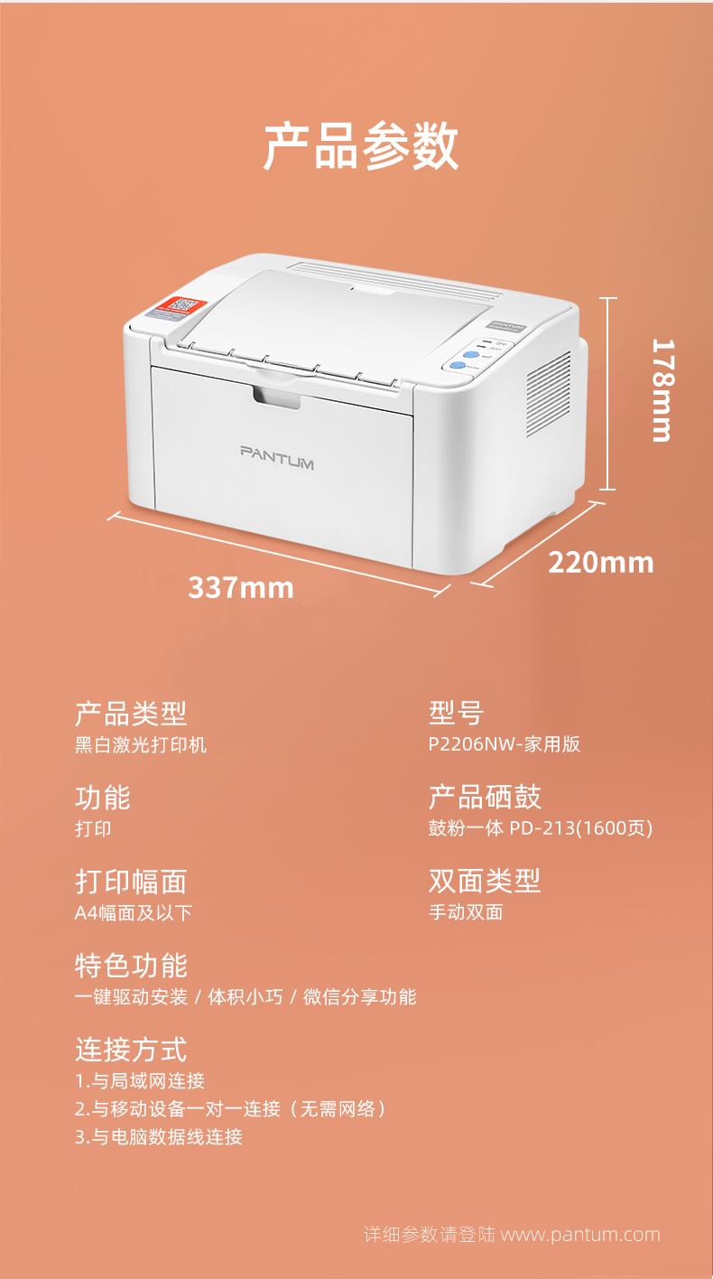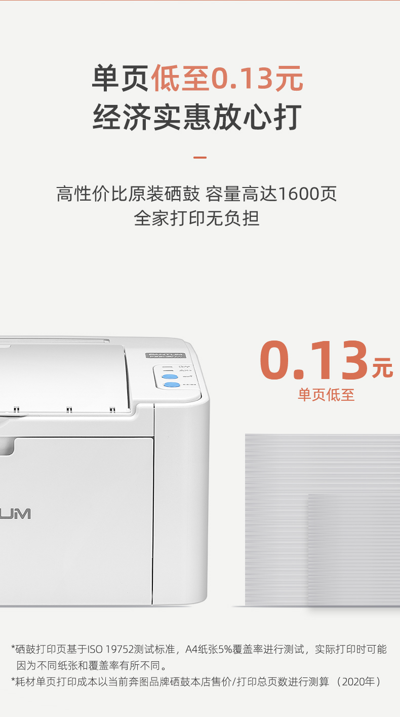商品属性 [品牌] 奔图 [型号] P2206NW [产品尺寸(mm)] 337 x 220 x 178 mm [打印机语言] GDI [支持纸张尺寸] A4,A5,A6,JIS B5,ISO B5,B6, Letter, Legal, Executive,Statement, Monarch envelope, DL envelope,C5 envelope,C6 envelope,NO.10 envelope, Japanese Postcard,Folio,Oficio,Big 16k, 32k,16k,Big 32k,ZL,Yougata4, Postcard, Younaga3, Nagagata3, Yougata2 [首次打印时间] 小于7.8秒 [节能证书编号] CQC18701202711 [商品单位] 台