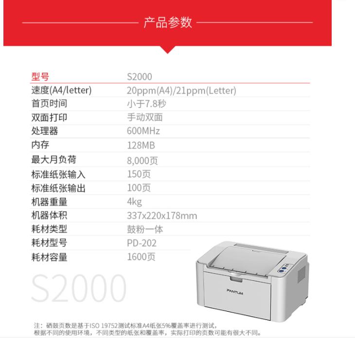 奔图(Pantum)S2000 A4黑白激光打印机