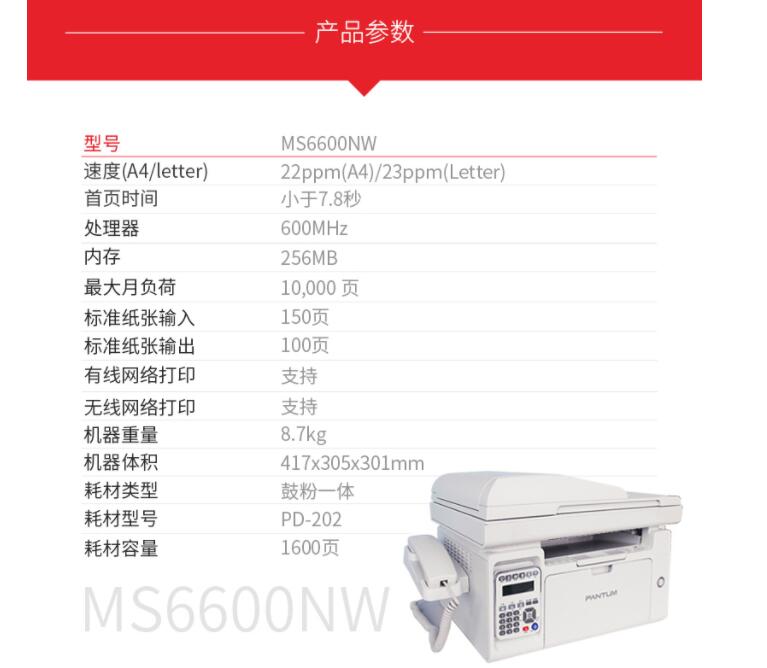 商品属性 [品牌] 奔图 [型号] MS6600NW [参数] 功能 打印;复印;扫描 [商品单位] 台 [幅面] A4 [节能证书编号] CQC18701202134
