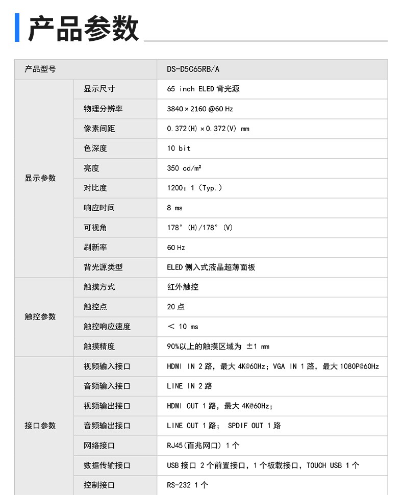 当前位置: 首页 > 政采分类 > 电脑、办公设备 > 办公设备 > 其它办公自动化设备 > 海康威视 触摸智能交互式电子白板远程视频会议教学一体机显示屏高清4K 65英寸DS-D5C65RB/A 标配