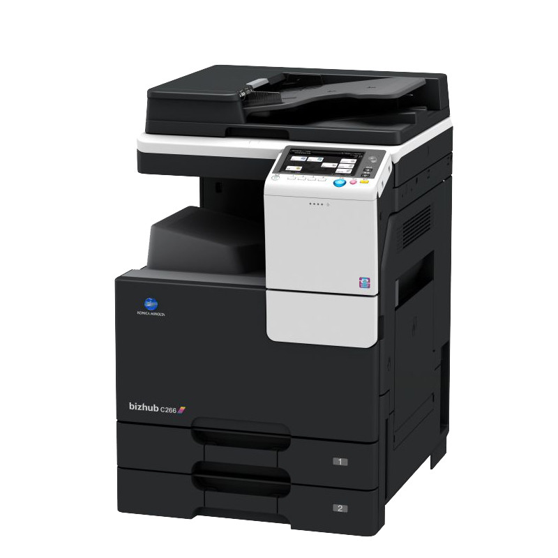 商品属性 [品牌] 柯尼卡美能达 [型号] Bizhub C266 [商品单位] 台 [复印类型] 数码复印机 [打印速度划分 ] 中速机(25页~50页/分钟) [技术类型] 彩色激光 [纸张尺寸] A3~A5,B6,A6,长纸 [复印速度 ] 26页/分钟 [最大功耗 ] 1.58kw [首页复印时间 ] 彩色 8.4秒 黑白 6.8秒 [打印速度] 26页/分钟 [打印幅面 ] A3幅面 [扫描速度] 30页/分钟 [纸张容量 ] 标配纸盒 500页 x 2 手送托盘 100页 [传真 分辨率 ] 扫描 600dpi x 600 dpi 打印 1800dpi(等效) x 600 dpi