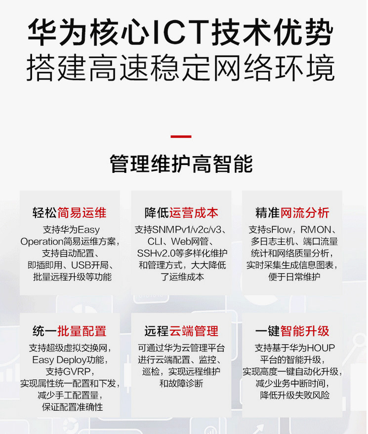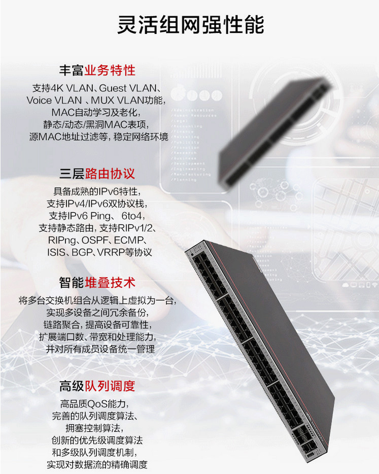 H3C S6520X-54HF-EI 48口汇聚交换机:交换容量2.56Tbps;包转发率 1620Mpps;配置:48个万兆SFP+端口,6个100GE QSFP28端口,48个万兆多模模块,含2个交流电源,1根40G高速线缆,3年保修,含安装调试