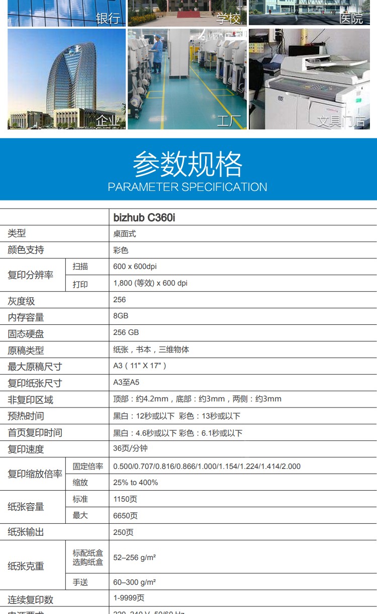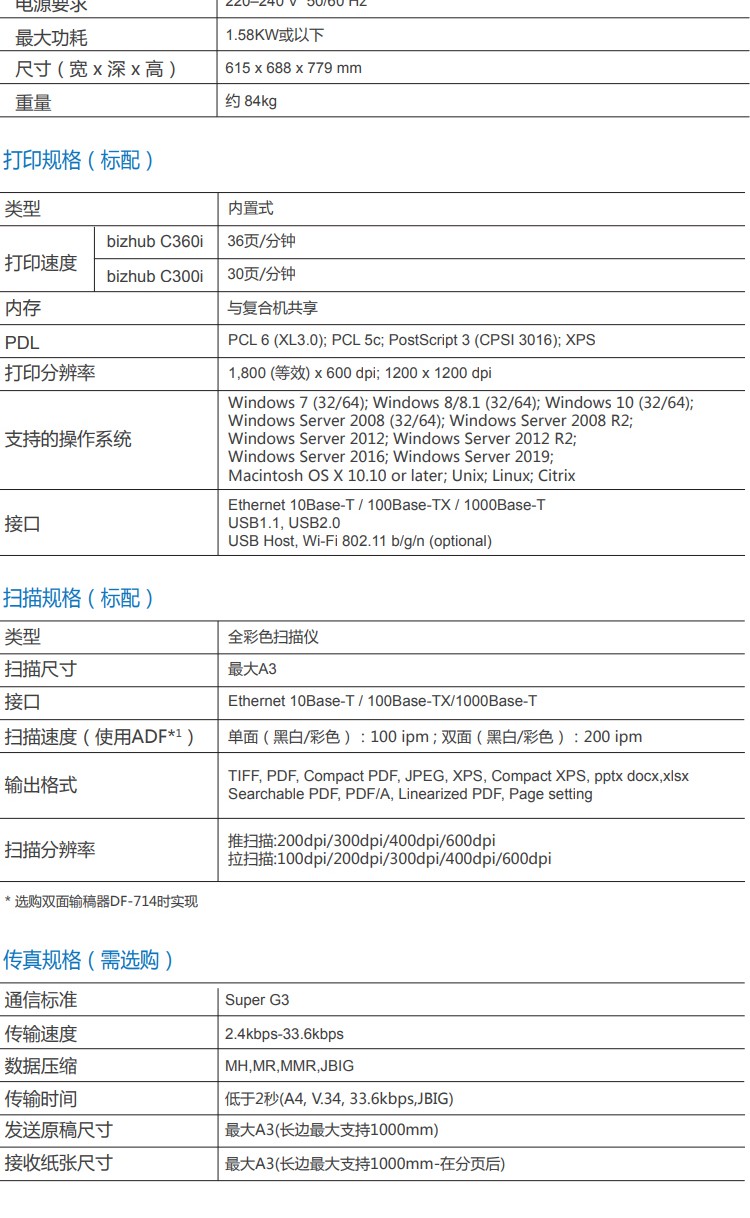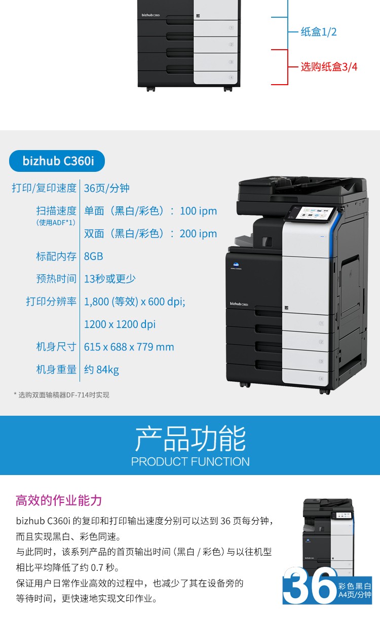 商品属性 [品牌] 柯尼卡美能达 [型号] bizhubC360i [参数] 打印控制器 PCL 6 (XL3.0); PCL 5c; PostScript 3 (CPSI 3016); XPS 操作系统 Windows Vista*1 / 7*1 / 8*1 / 8.1*1 Windows Server 2003*1 / 2003 R2*1 / 2008*1 / 2008 R2 / 2012 / 2012 R2 Mac OS X (10.6/10.7/10.8/10.9/10.10) Linux 分辨率 1800dpi(等效)x 600dpi(平滑模式下)或 1200dpi×1200dpi(在1200dpi模式下) 网络协议 TCP/IP, IPX/SPX(支持NDS), SMB(NetBEUI), LPD, IPP1.1, SNMP, Apple Talk [商品单位] 台 [纸张尺寸] 最大原稿尺寸 A3(11 [复印速度 ] 36页/分钟 [最大功耗 ] 1.5kW或以下 [首页复印时间 ] 黑白:4.6秒或以下,彩色:6.1秒或以下 [打印速度] 36页/分钟 [扫描速度] 单面(黑白/彩色):100 ipm ; 双面(黑白/彩色):200 ipm [纸张容量 ] 标准 1150页