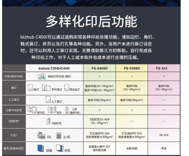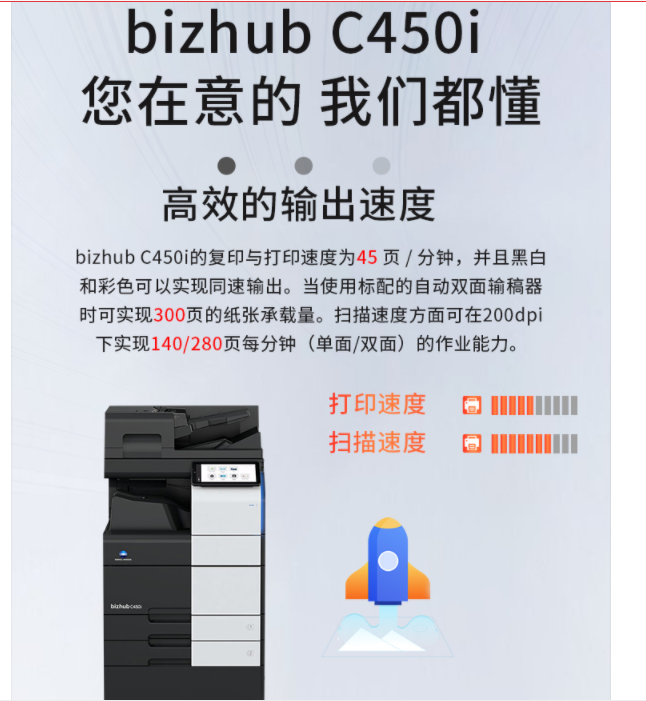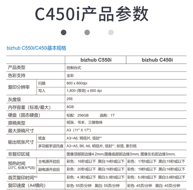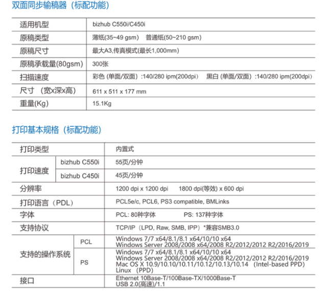 商品属性 [品牌] 柯尼卡美能达 [型号] bizhubC450i [参数] 操作系统 PCL:Windows7-10(详见商详) PS:MAC OSX(详见商详) 分辨率 1800dpi(等效)×600dpi 网络协议 TCP/IP 打印语言 详见商详 打印速度 45页/分钟 [商品单位] 台 [复印速度 ] 45页/分钟 [首页复印时间 ] 黑白3.8秒 彩色5秒