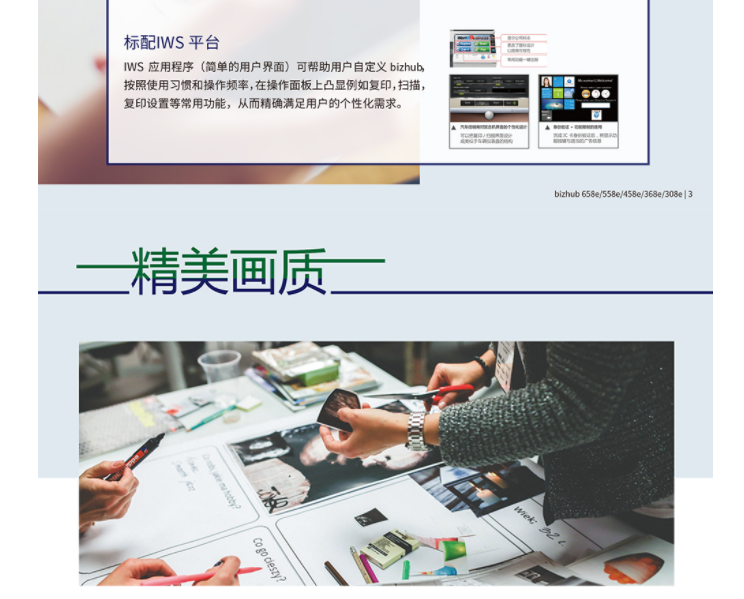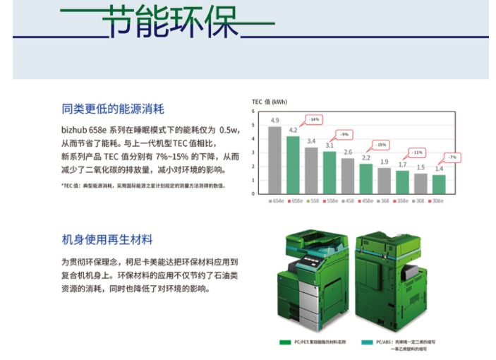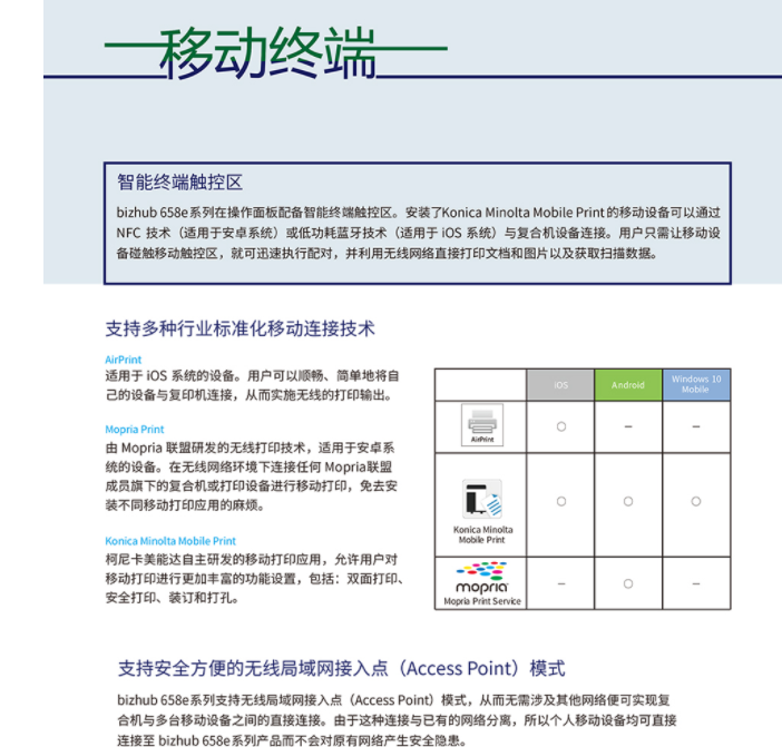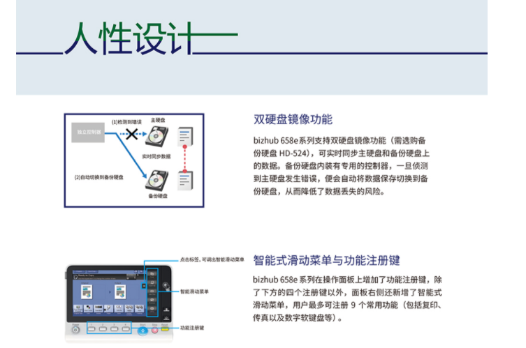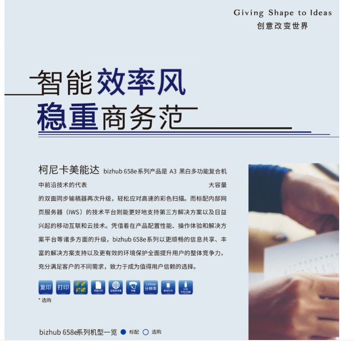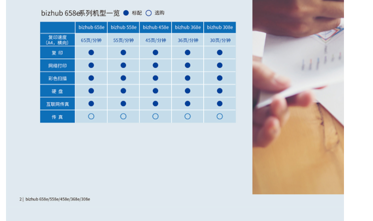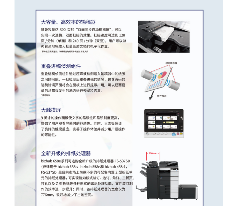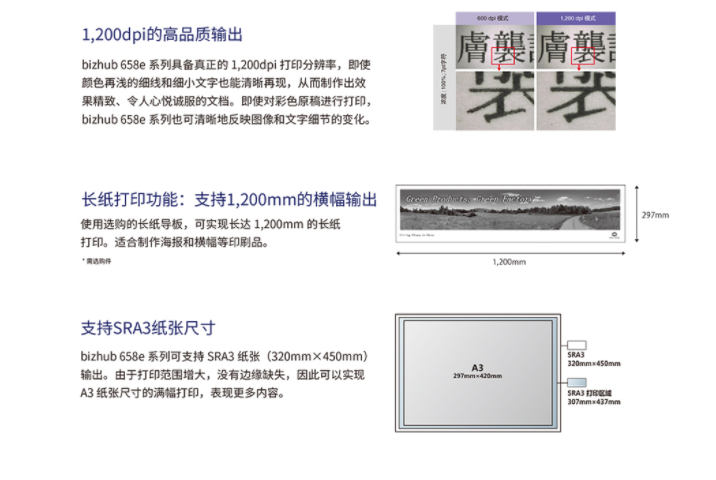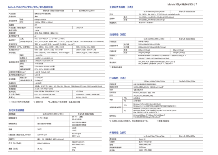 商品属性 [品牌] 柯尼卡美能达 [型号] bizhub658e [参数] 分辨率 推扫描 200dpi/300dpi/400dpi/600dpi 拉扫描 100dpi/200dpi/300dpi/400dpi/600dpi 扫描速度 单面 120ipm (300dpi) 双面 240ipm (300dpi) 扫描文件格式 TIFF,JPEG,PDF,压缩PDF,OOXML [商品单位] 台 [纸张尺寸] 最大原稿尺寸 A3 [复印速度 ] ≤65ppm [首页复印时间 ] ≤3秒 [打印速度] ≤65pp [纸张容量 ] 标准纸张容量(80g/m²) 1,150页(500x2+150)
