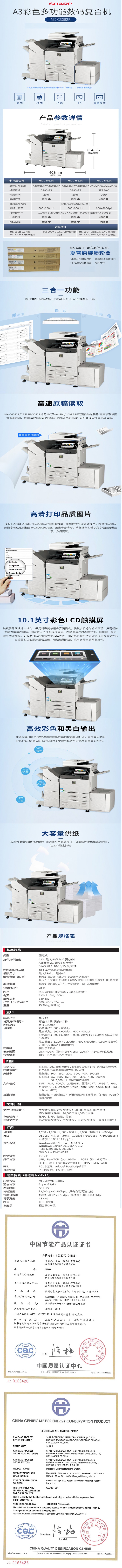 商品属性 [品牌] 夏普 [型号] MX-C3082R [参数] 预热时间 20秒 纸张尺寸 最大SRA3,最小A5 纸张重量 纸盒∶60~300g/m²;手送纸盒∶55~300g/m² 复印速度 A4:30页/分钟 连续复印张数(张) 最多9999份 最大功耗 1.84kw 首页复印时间 彩色∶6.7秒,黑白∶4.7秒 [商品单位] 台