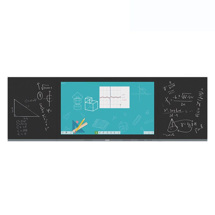 6.整机中间主屏及两侧副屏可支持多种媒介进行板书书写,便于老师完整书写教学内容。整机书写面板采用耐磨玻璃材质,长期书写情况下面板磨损导致的雾度不超过1%。