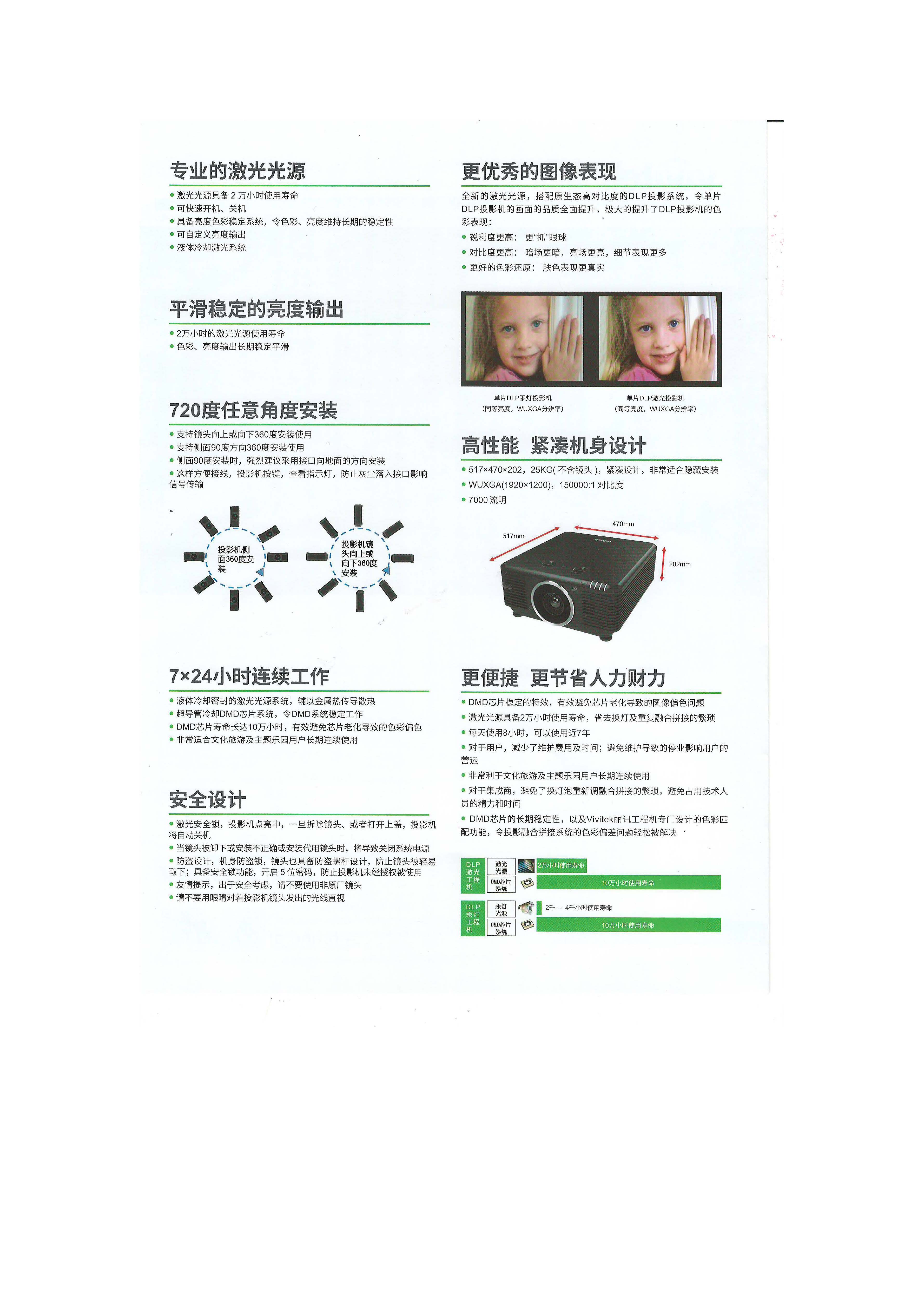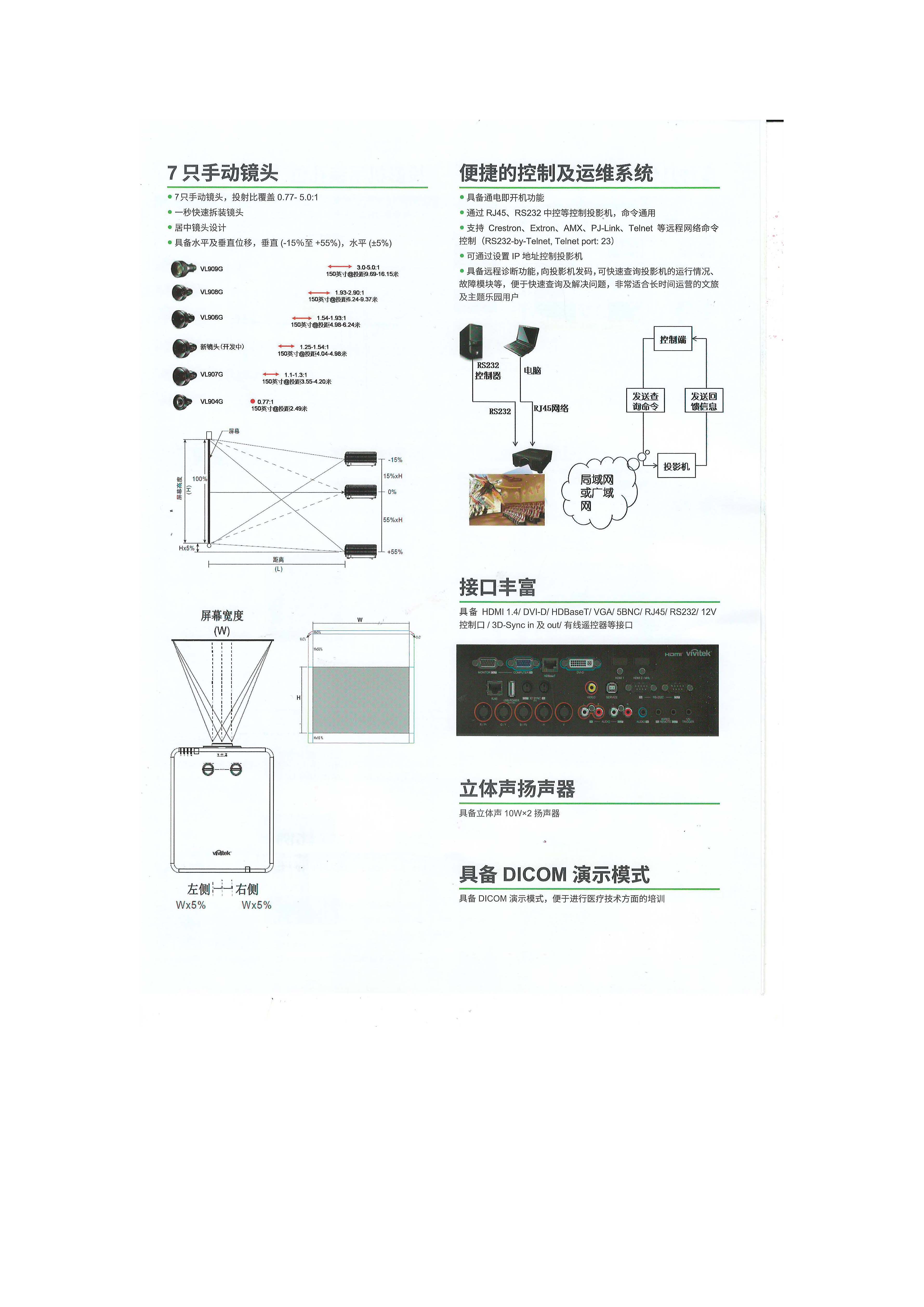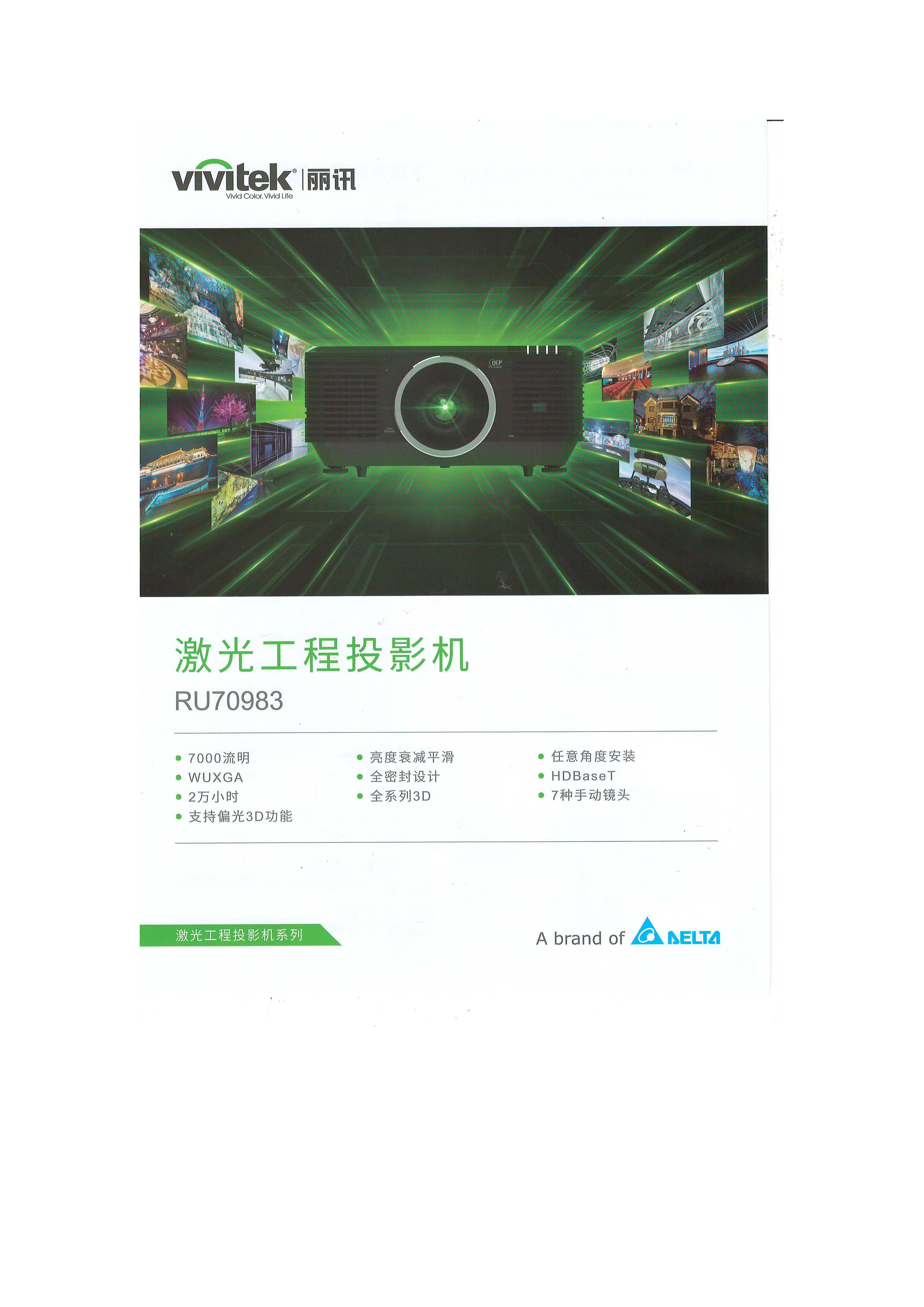 商品属性 [品牌] 丽讯 [型号] RU70983 [商品单位] 台 [参数] 1.采用DMD芯片技术,亮度:7000 流明,分辨率:1920*1200以上,DLP对比度15万:1,数码工程激光投影机,激光光源寿命2万小时以上,可达1677万色; 2.可以镜头向上、向下或侧面360度安装使用;支持几何校正,内置安装参考网格,以及RGBWB色彩测试图,方便用户进行投影预安装定位; 2. 适于融合拼接设计,带保存功能,融合拼接项目中,方便用户微调色彩及亮度,以保持大屏幕画面的一致性; 3.支持单机DLP-Link 3D、IR 3D及蓝光3D,支持多种格式3D内容;具备3D-Sync in及out接口,实现3D同步;可实现多台投影机主动式3D融合拼接;3D 同步信号:DLP Link、红外线; 4.HDBaseT网线传送视频及音频信号,内置HDBaseT接收器,通过Cat5e网线及选配的HDBaseT发射器,支持100米距离传送视频及音频信号;支持4K信号输入;具备HDMI 1.4/ DVI-D/ HDBaseT/ VGA/ 5BNC/ RJ45/ RS232/ 12V控制口/ 3D-Sync in及out/ 有线遥控器等接口 3.通电即开机,可以采用通用的命令通过RJ45网络、或者RS232中控控制投影机;有激光安全锁和防盗设计; 2、搭配适合现场条件的短焦镜头;