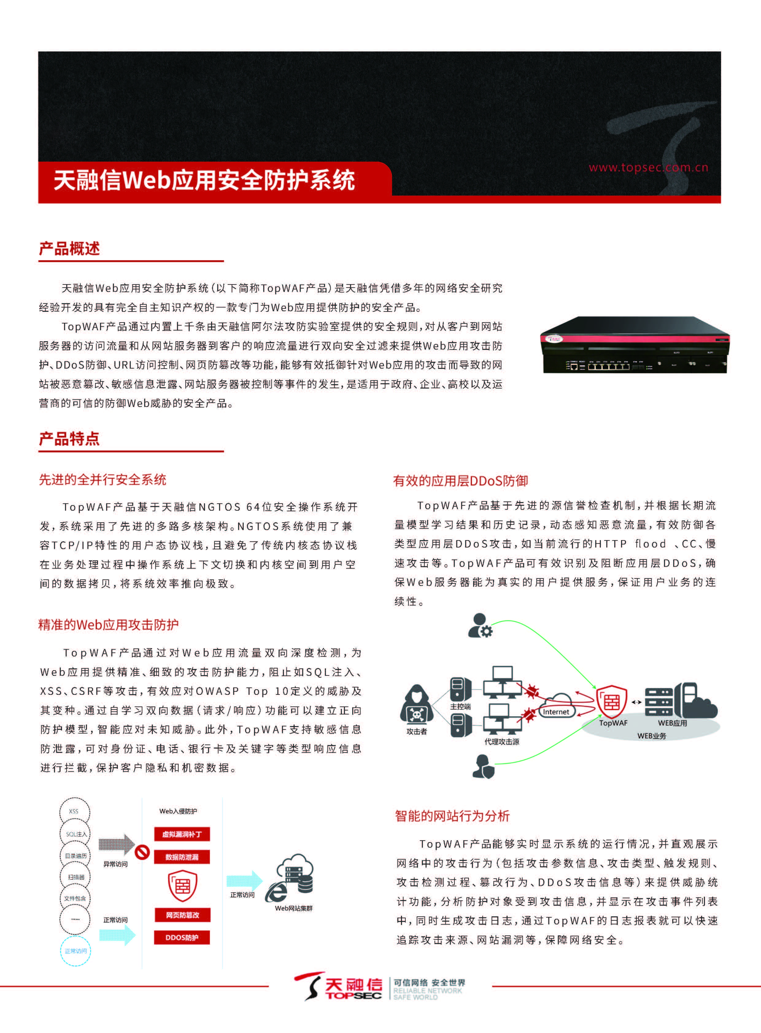 商品属性 [品牌] 天融信 [型号] TopWAF(TWF-72180) [商品单位] 套 [参数] 2U机架式/最大配置为26个接口/双电源/自带液晶屏/WAF产品特征库5年升级License/5年特征库升级服务