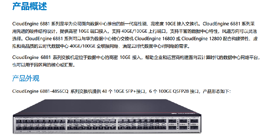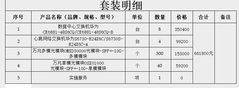 商品属性 [品牌] 华为 [参数] 数据中心交换机华为 CE6881-48S6CQ/CE6881-48S6CQ-B*8、心跳网络交换机华为S6730-H24X6C/S6730S-H24X6C-A*4/万兆多模光模块OMXD30000光模块-SFP+-10G-多模模块*300/万兆单模光模块OSX01000 光模块-SFP+-10G-单模模块*40、实施服务 [型号] CE6881-48S6CQ、S6730-H24X6C [商品单位] 套