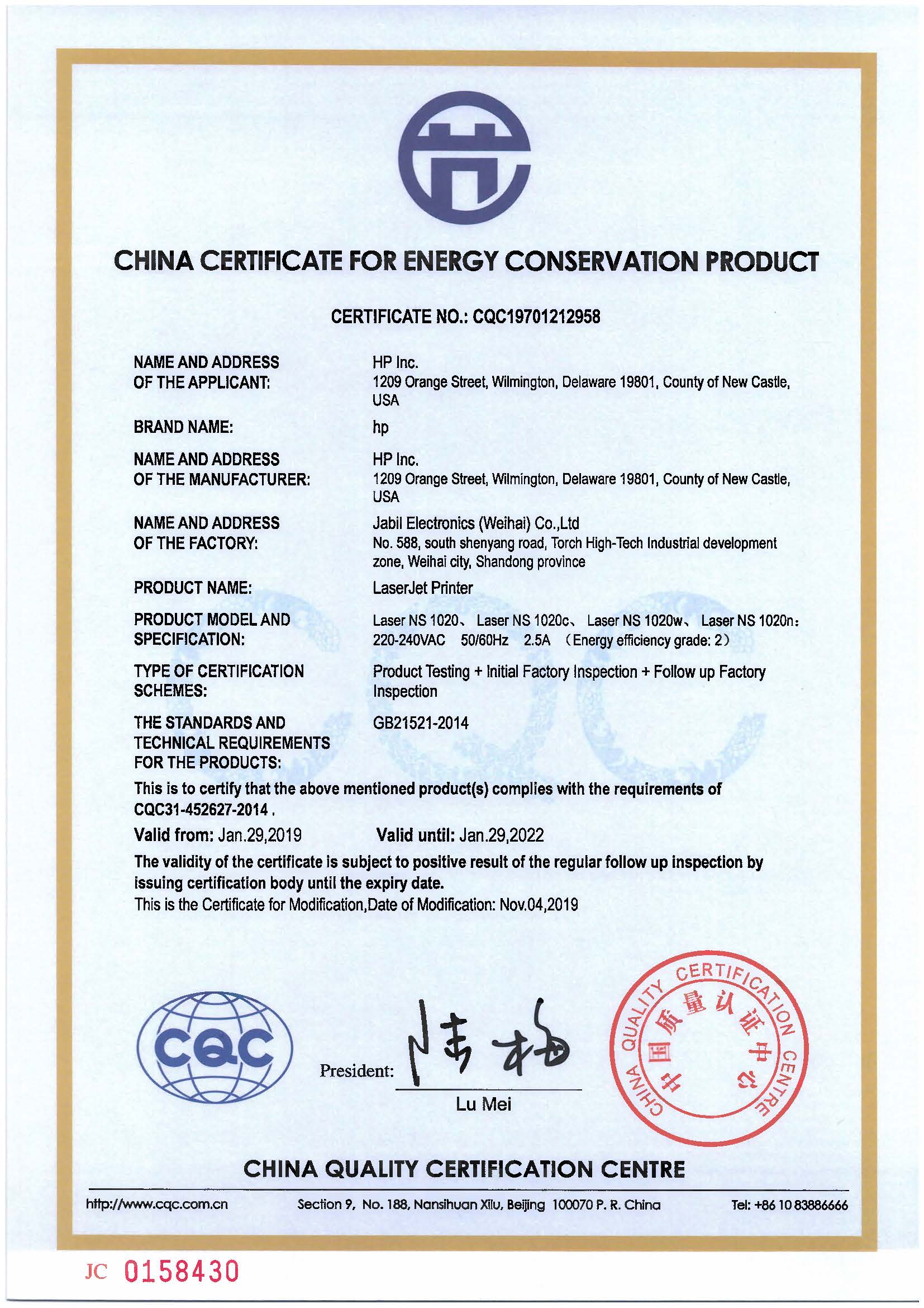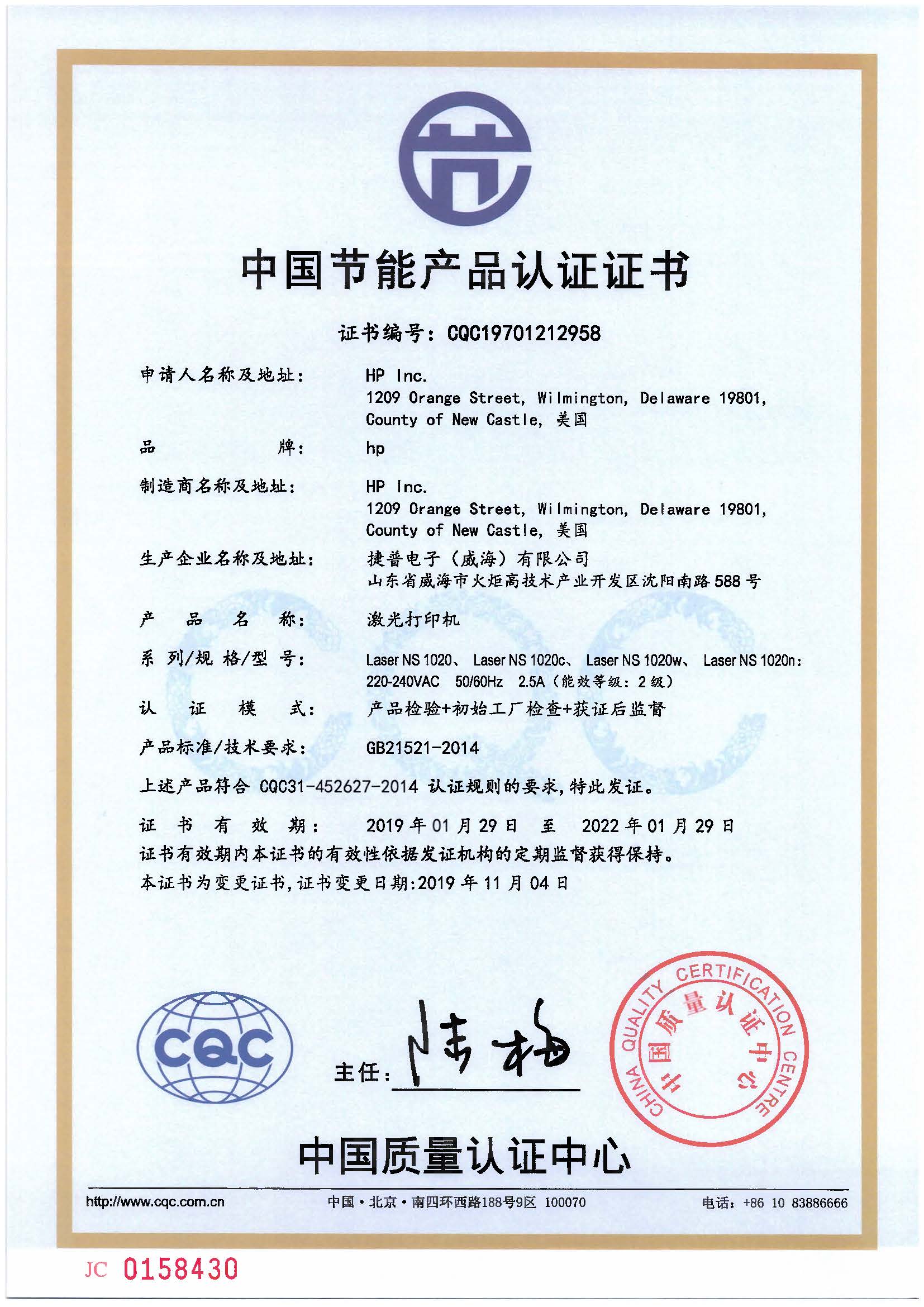 商品属性 [品牌] 惠普 [型号] Laser NS1020n [商品单位] 台 [节能证书编号] CQC19701212958
