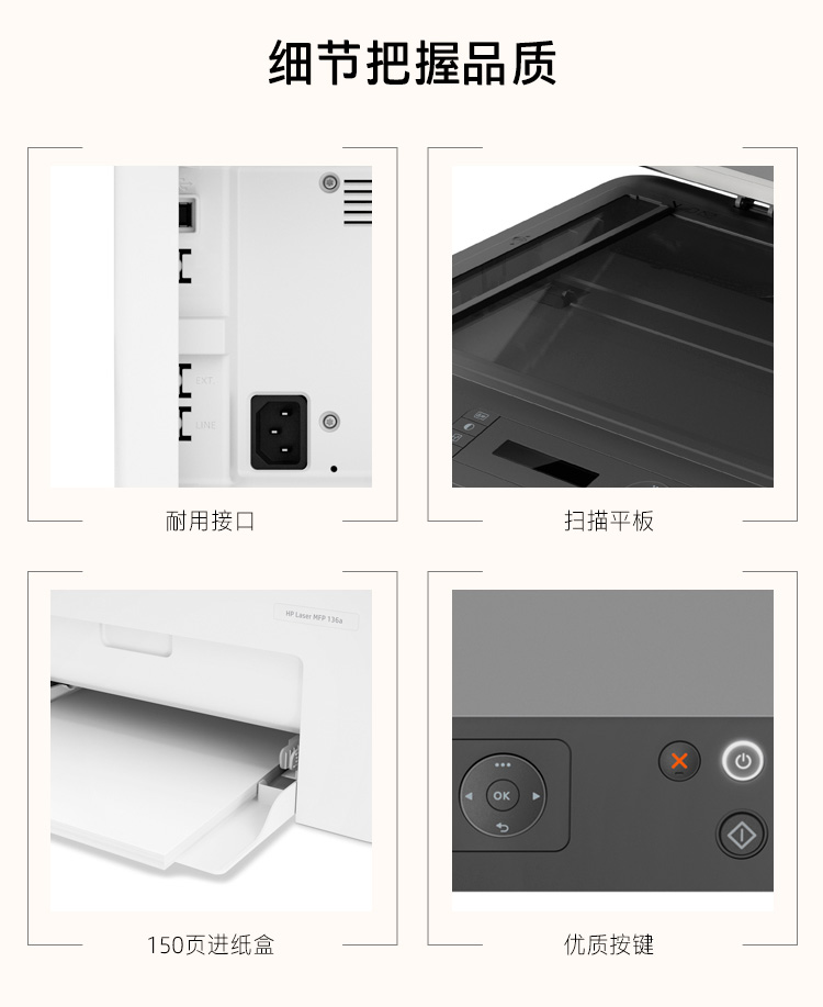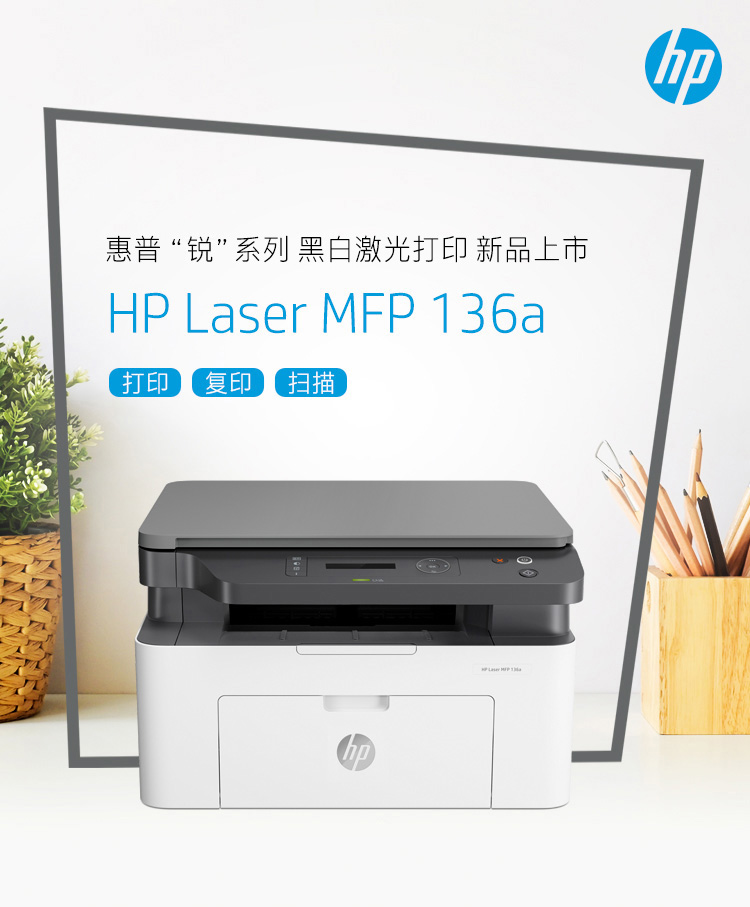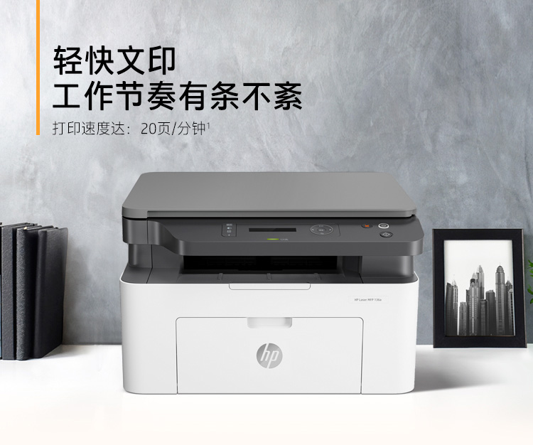 商品属性 [品牌] 惠普 [型号] Laser MFP 136a [节能证书编号] CQC19701211978 [产品类型] 黑白激光 [打印分辨率] 1200×1200DPI [涵盖功能] 打印/复印/扫描 [最大处理幅面] A4 [黑白打印速度] A4:20ppm,letter:21ppm [双面打印] 不支持 [数据接口] USB2.0