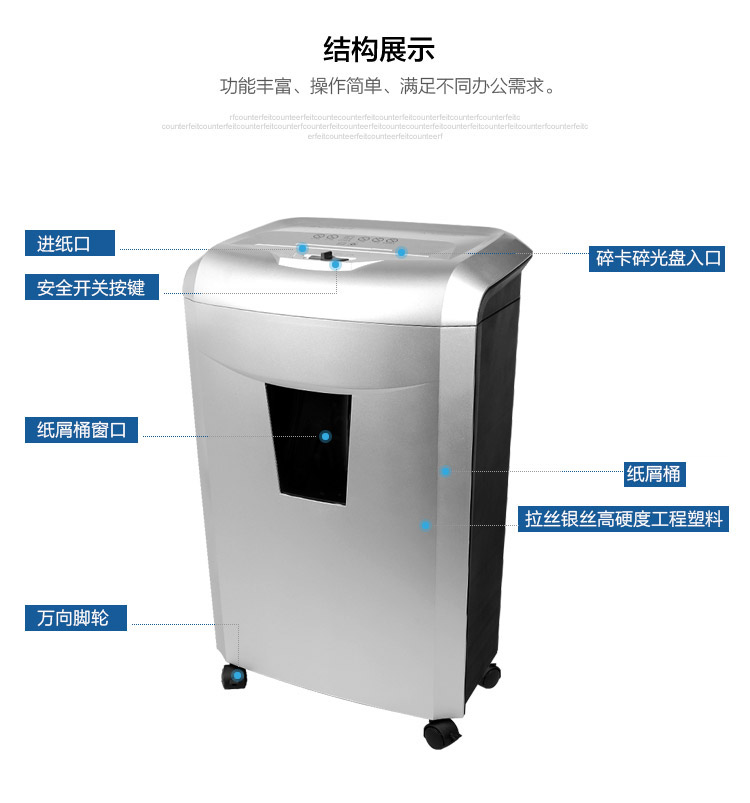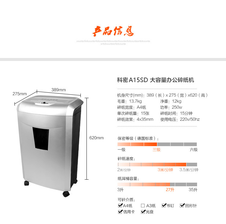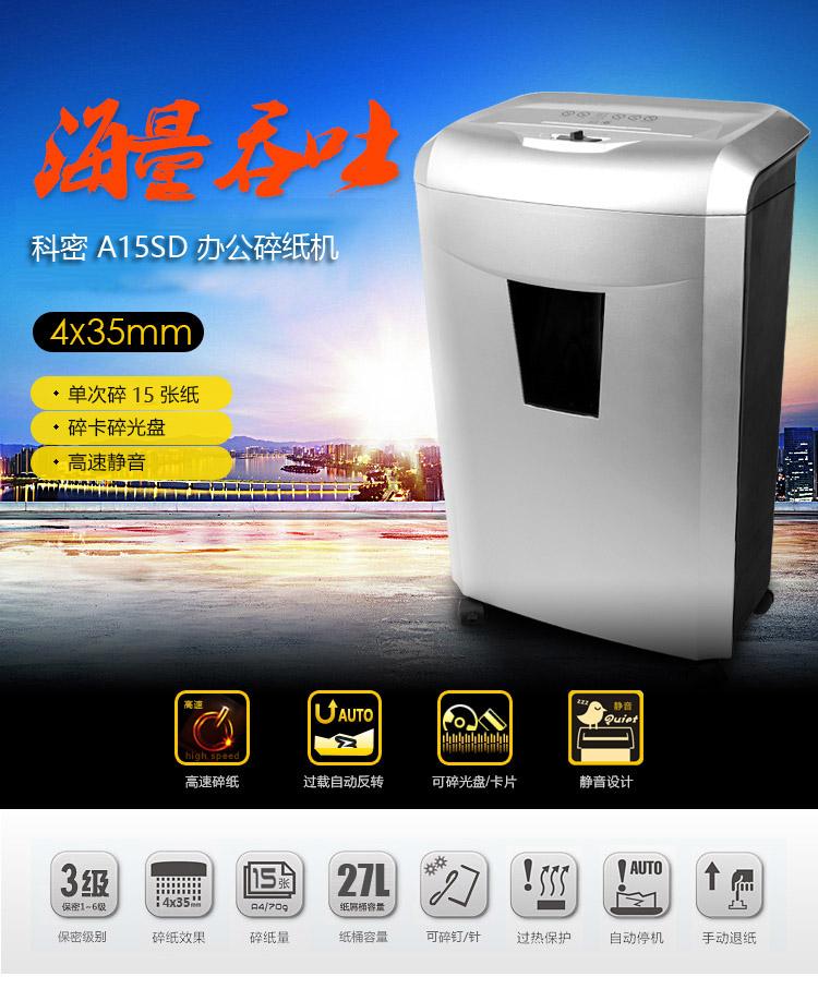 商品属性 [品牌] 科密 [型号] A15SD [商品单位] 台 [碎纸速度] 2.1-3.0米/分钟 [噪音分贝] 50-60dB [入纸宽度] 225mm [尺寸] 389×275×620mm [连续粉碎时间(min)] 11-20分钟 [碎纸能力(张/次)] 15张/次 [碎纸箱容积(L)] 27L [粉碎材质] 纸,光盘,卡 [粉碎方式] 段状 [售后服务内容] 1年质保 [碎纸效果] 4×40mm [质保时间] 1年