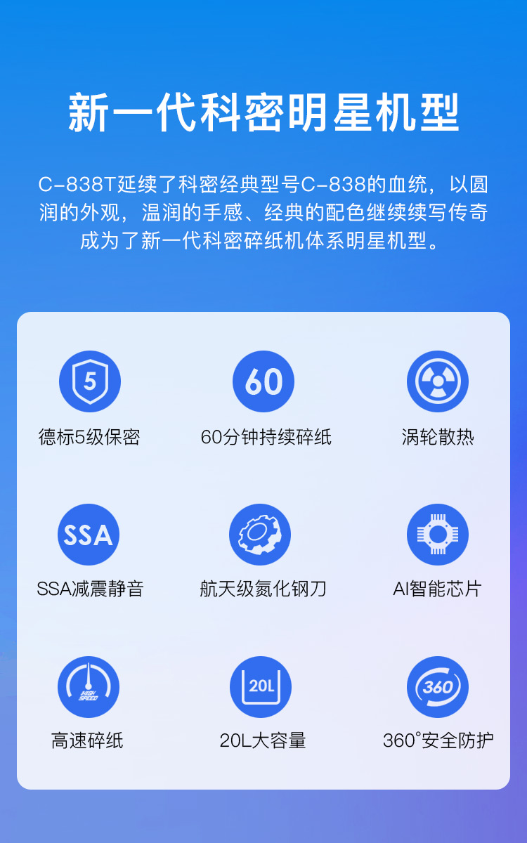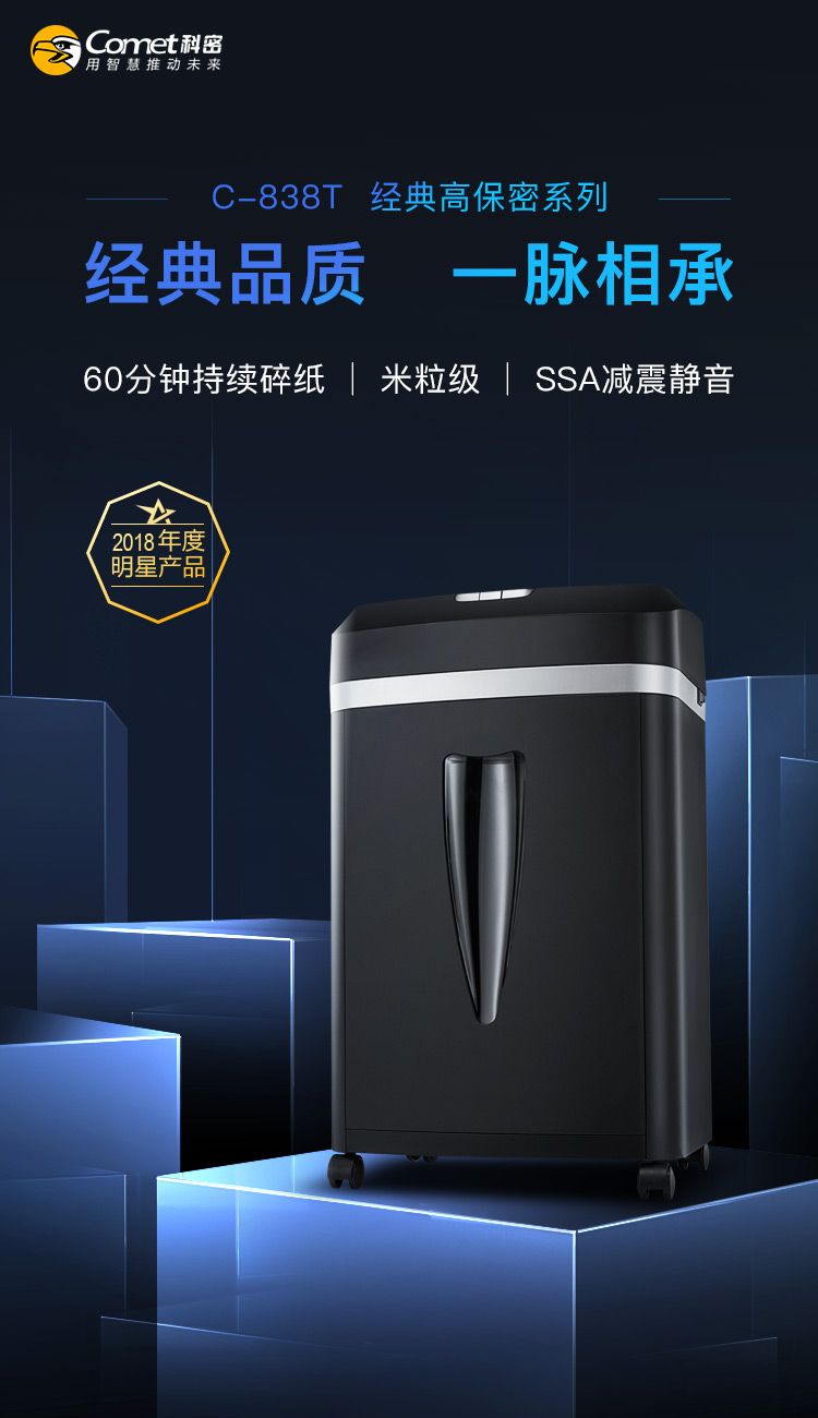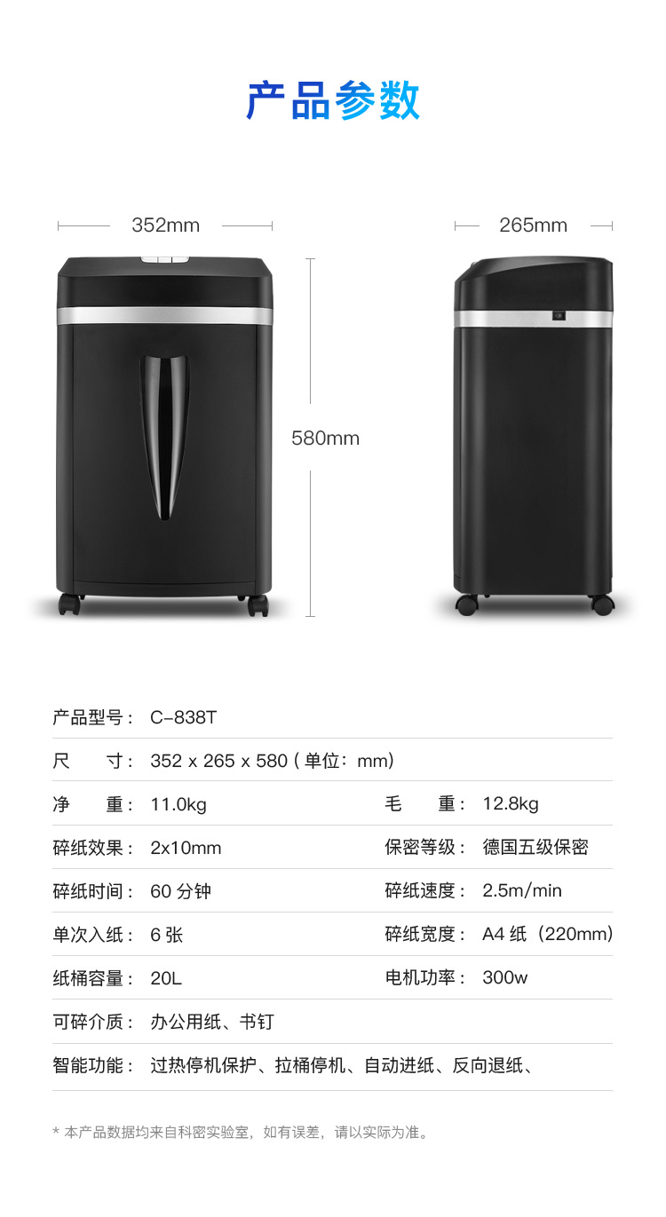 商品属性 [品牌] 科密 [型号] C-838T [商品单位] 台 [碎纸速度] 2.5米/分 [噪音分贝] 50-60dB [入纸宽度] 220mm [连续粉碎时间(min)] 41-60分钟 [碎纸能力(张/次)] 6张/次 [碎纸箱容积(L)] 20L [粉碎材质] 纸 [粉碎方式] 粒状 [售后服务内容] 1年质保 [碎纸效果] 2×10mm [质保时间] 1年