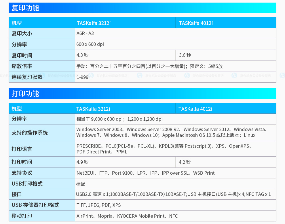 商品属性 [品牌] 京瓷 [型号] 3212i [商品单位] 台 [标配纸盒容量] 1000 [复印分辨率] 600 x 600dpi [双面输稿器] 有 [装订器] 无 [最大复印尺寸] A3 - A6R [首页输出时间] 4.3 秒 [预热时间] 18 秒 [质保时间] 3年 [内存容量] 标配 2GB [售后服务内容] 3年质保