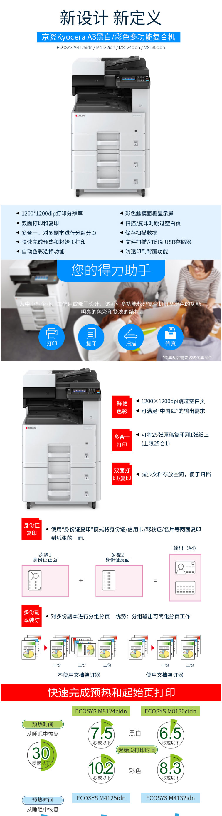 商品属性 [品牌] 京瓷 [型号] ECOSYS M8124cidn [商品单位] 台 [标配纸盒容量] 600张 [复印分辨率] 600*600dpi [最大复印尺寸] A3 - A6R [首页输出时间] 7.6/9.8秒 [预热时间] 30秒以内 [质保时间] 3年 [内存容量] 标配 1.5GB [售后服务内容] 3年质保