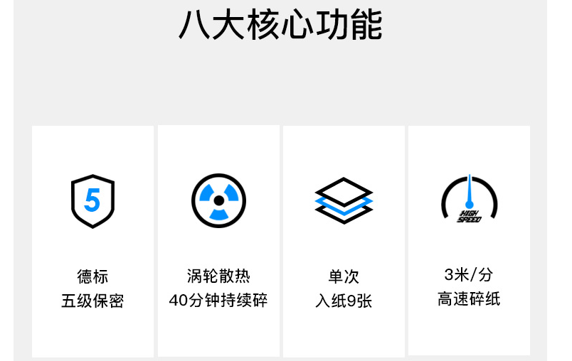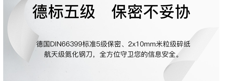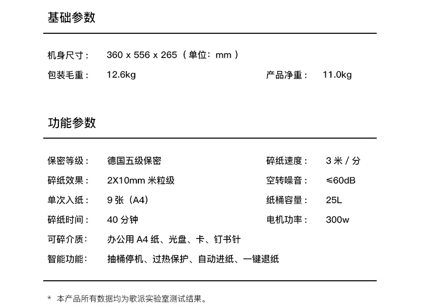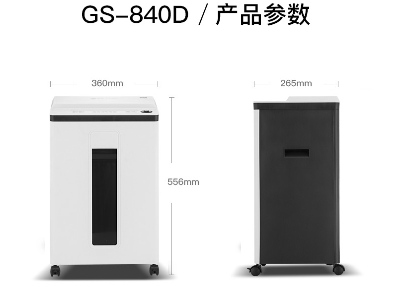 商品属性 [品牌] 歌派 [型号] GS-840D [商品单位] 台 [碎纸速度] 2.1-3.0米/分钟 [噪音分贝] 40-50dB [连续粉碎时间(min)] 31-40分钟 [碎纸能力(张/次)] 9张 [碎纸箱容积(L)] 25L [粉碎材质] 办公用A4纸,光盘,卡,订书针 [粉碎方式] 段状 [售后服务内容] 1年质保 [碎纸效果] 段状 [质保时间] 1年