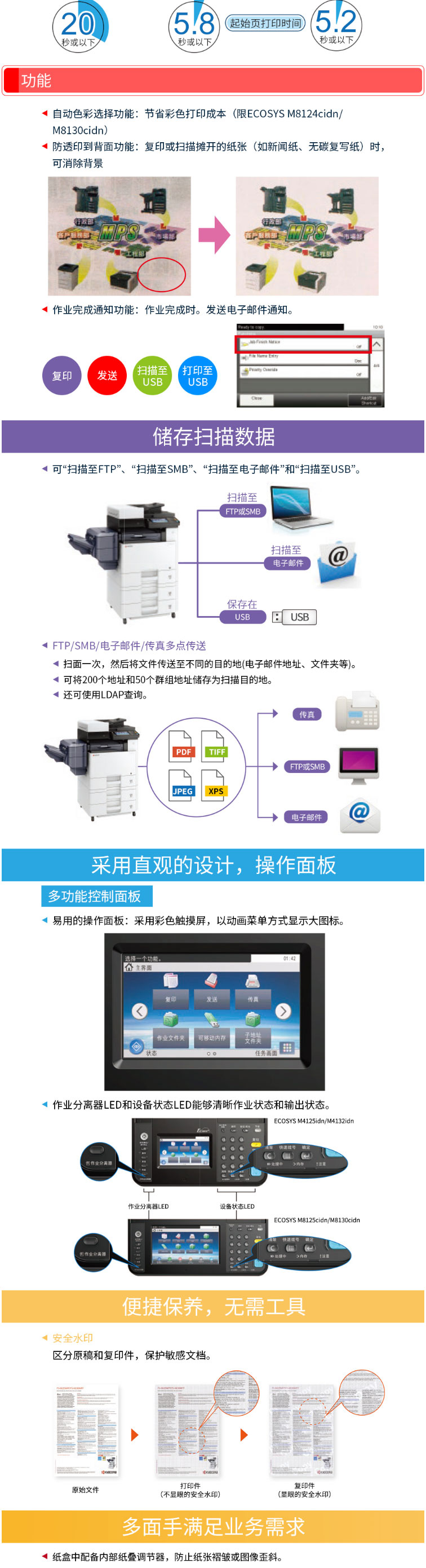 商品属性 [品牌] 京瓷 [型号] ECOSYS M8124cidn [商品单位] 台 [标配纸盒容量] 600张 [复印分辨率] 600*600dpi [装订器] 无 [最大复印尺寸] A3 - A6R [首页输出时间] 7.6/9.8秒 [预热时间] 30秒以内 [质保时间] 3年 [内存容量] 标配 1.5GB [售后服务内容] 3年质保
