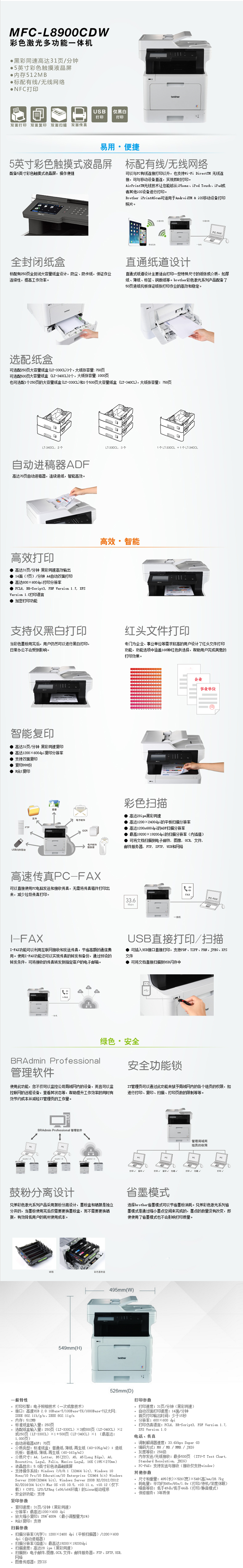 商品属性 [品牌] 兄弟 [型号] MFC-L8900CDW [节能证书编号] CQC17701166188 [商品单位] 台 [打印分辨率] 600×600 dpi [黑白打印速度] 31PPM [最大打印幅面] A4 [自动双面打印] 支持 [质保时间] 1年 [售后服务内容] 一年有限保修 [数据接口] 高速USB 2.0 10Base-T/100Base-TX/1000Base-T以太网; IEEE 802.11b/g/n、IEEE 802.11g/n [随机附件] 标配 [彩色打印速度] 31PPM