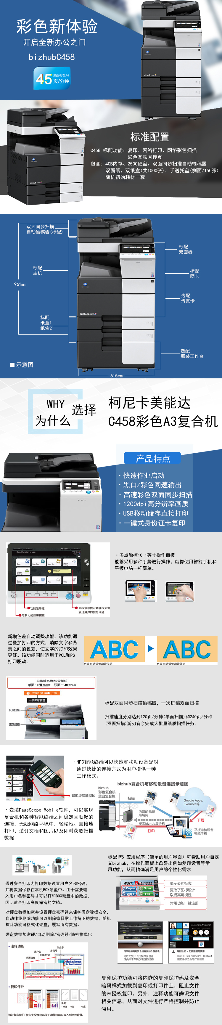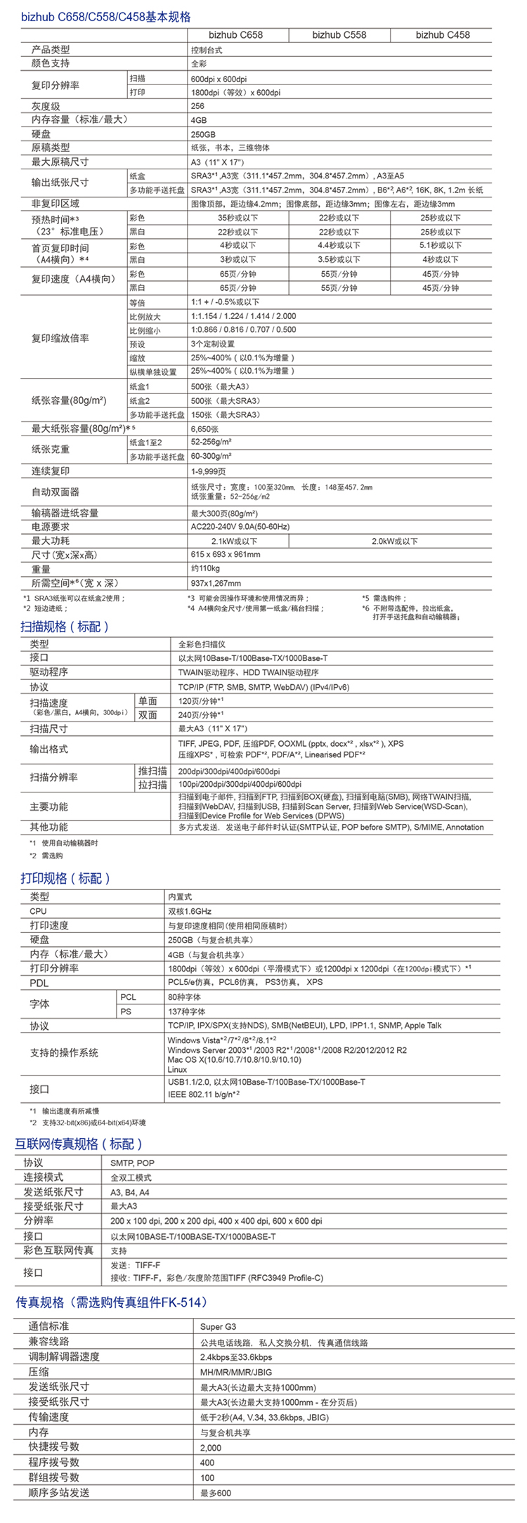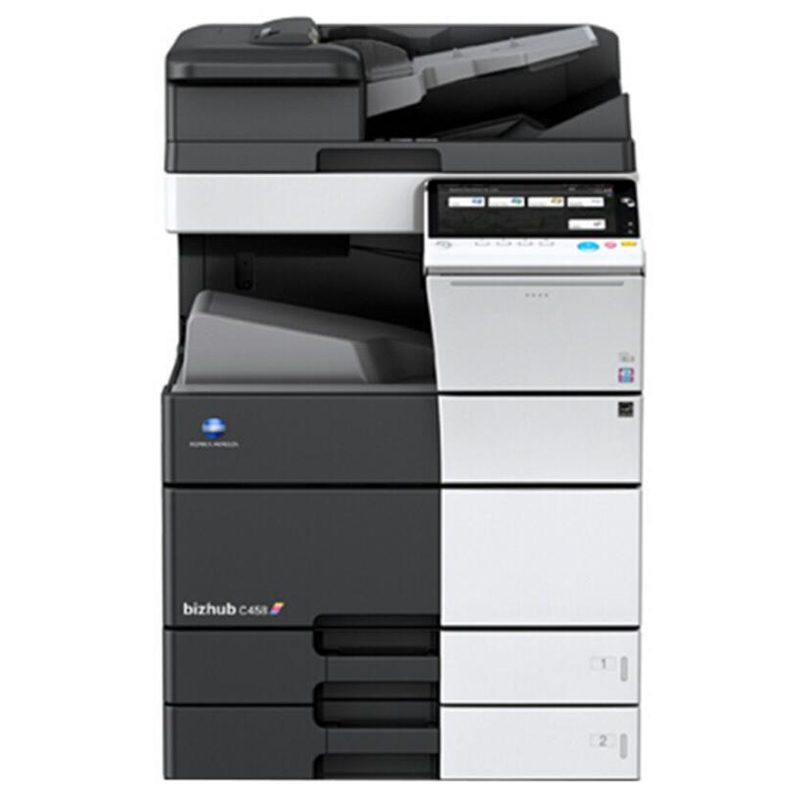 商品属性 [品牌] 柯尼卡美能达 [型号] C458 [商品单位] 台 [复印速度 ] (A4横向):45页/分钟; [标配纸盒容量] 纸盒1:500张、纸盒2:500张、手送纸盒:150张; [复印分辨率] 1800dpi*600dpi [双面器] 有 [双面输稿器] 有 [网络打印卡] 有 [装订器] 有 [最大复印尺寸] A3+ [首页输出时间] 彩5.1秒或以下、黑白4秒或以下; [预热时间] 25秒或以下 [质保时间] 5年 [内存容量] 4GB [数据接口] USB1.1/2.0,以太网10Base-T/100Base-TX/1000Base-T IEEE 802.11b/g/n [随机附件] 彩色数码多功能机*1、电源线*1、电源线支架组件*1、墨盒组件(4支/套)*1、用户操作手册*1、驱动&用户手册(光盘)*1、Exit2 Tray*1、保修凭证 [售后服务内容] 厂商质保