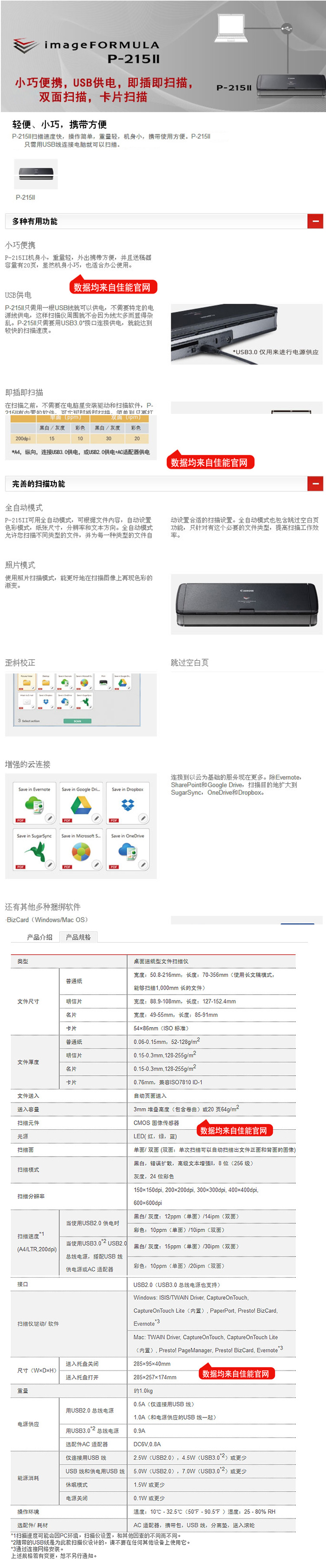 商品属性 [品牌] 佳能 [型号] P-215II [幅面] A4 [多介质扫描] 文件、卡片 [扫描速度] 黑白/灰度:15ppm(单面)30ipm(双面);彩色:10ppm(单面)15ipm(双面) [分辨率(平板/馈纸式)] 600dpi