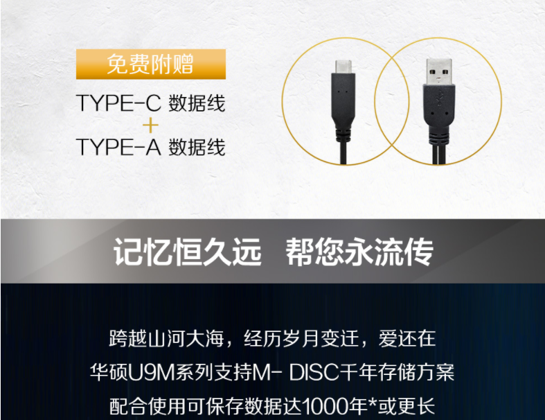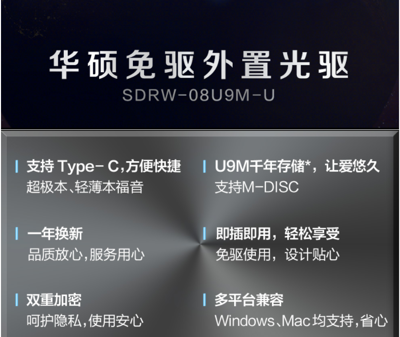华硕(ASUS) 8倍速 外置DVD刻录机 移动光驱 支持USB/Type-C接口 (兼容苹果系统/SDRW-08U9M-U)-黑色