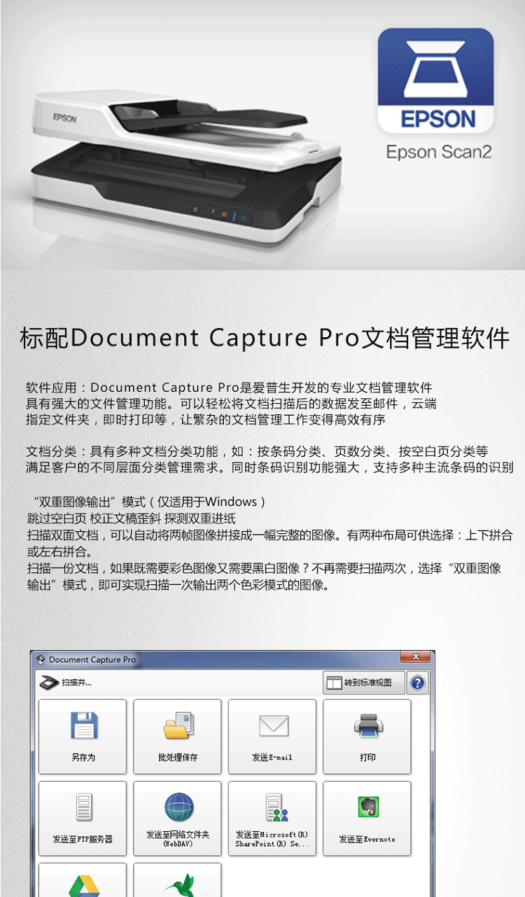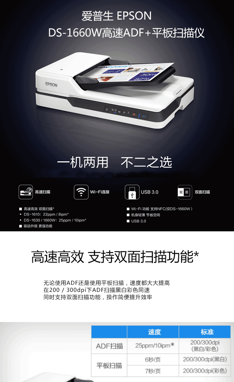 爱普生(EPSON)DS1660W A4 ADF+平板高速彩色文档扫描仪无线网络 (企业版)
