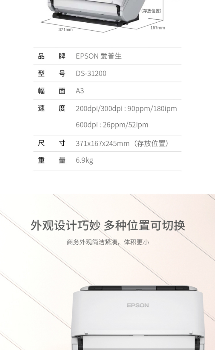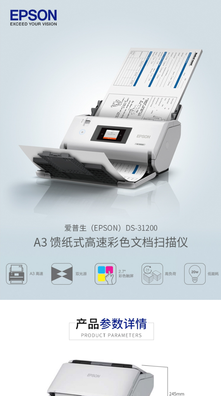 爱普生(EPSON)DS-31200 A3大幅面馈纸式彩色文档高速扫描仪 双面扫描/90ppm