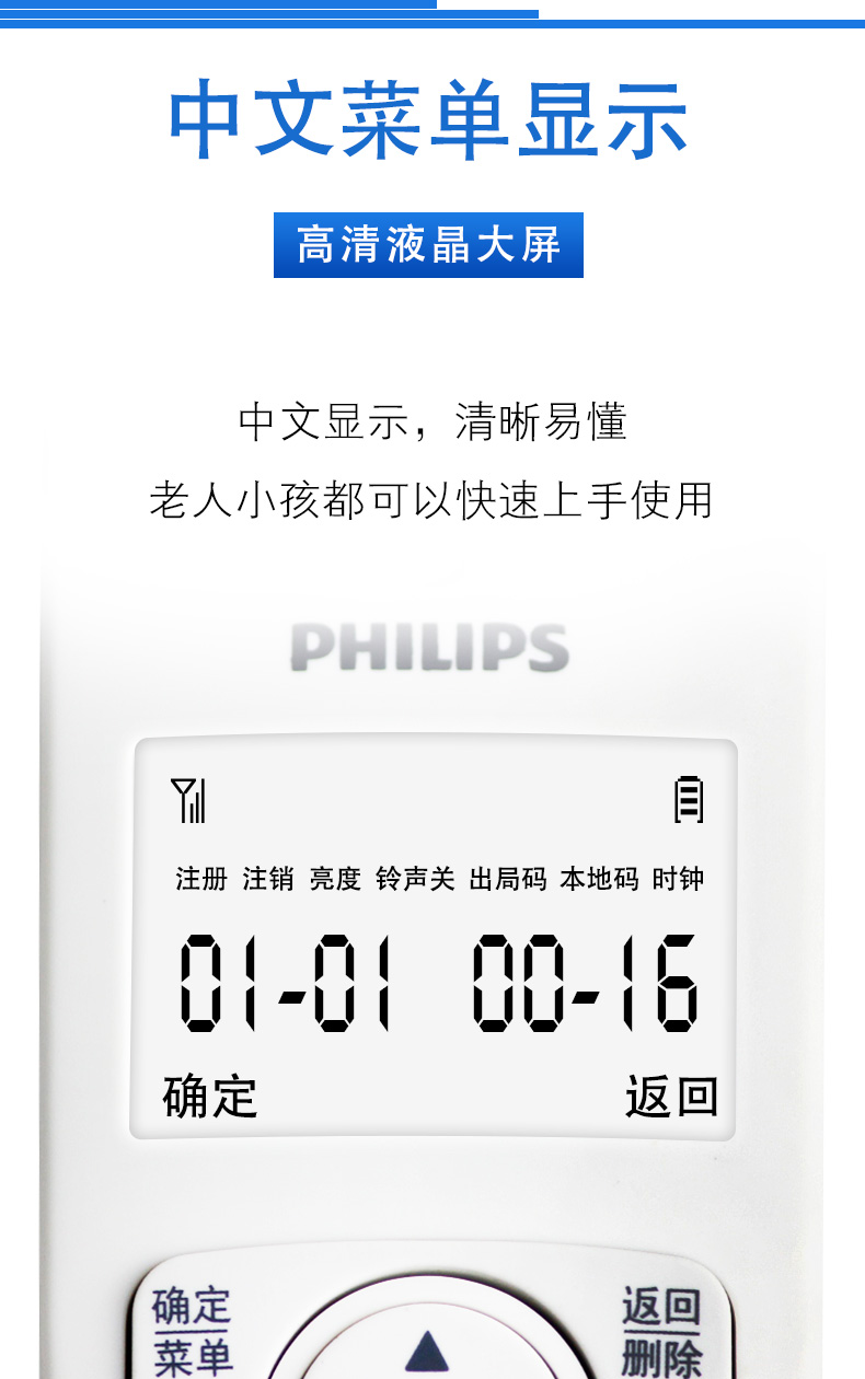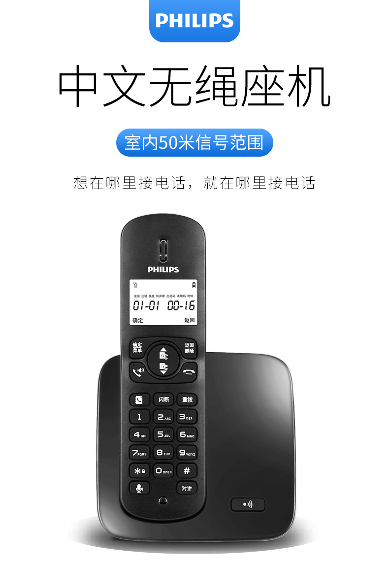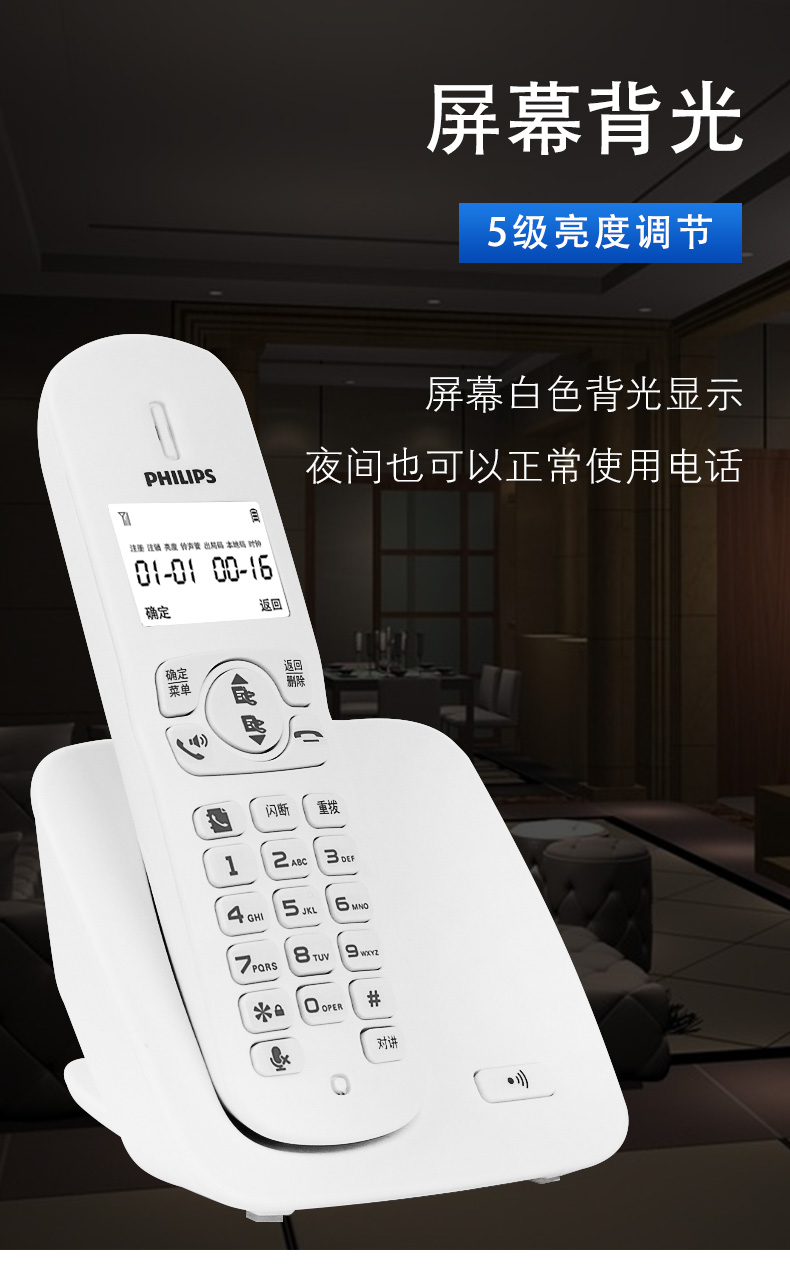 飞利浦(PHILIPS)无绳电话机 无线座机 子母机 办公家用 屏幕白色背光 持久待机 DCTG186白色