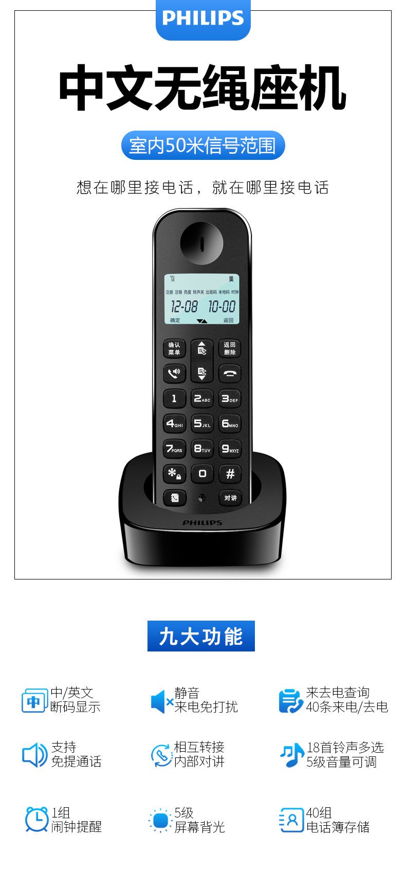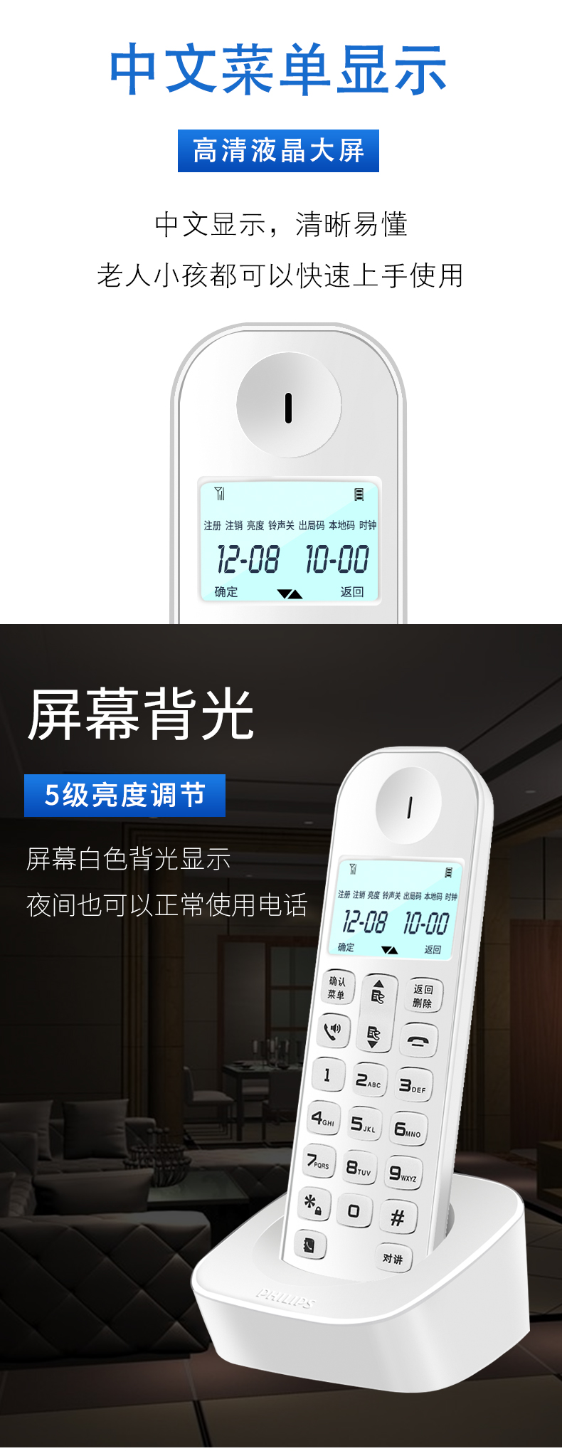 飞利浦(PHILIPS)无绳电话机 无线座机 子母机 办公家用 屏幕白色背光 持久待机 DCTG186白色