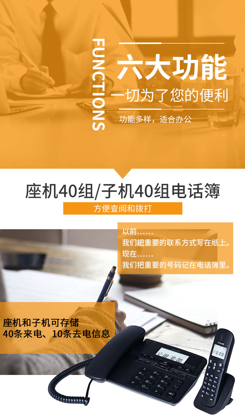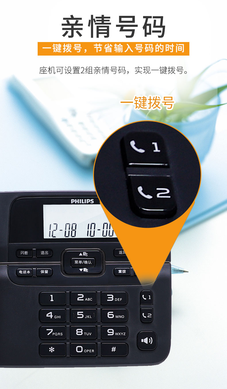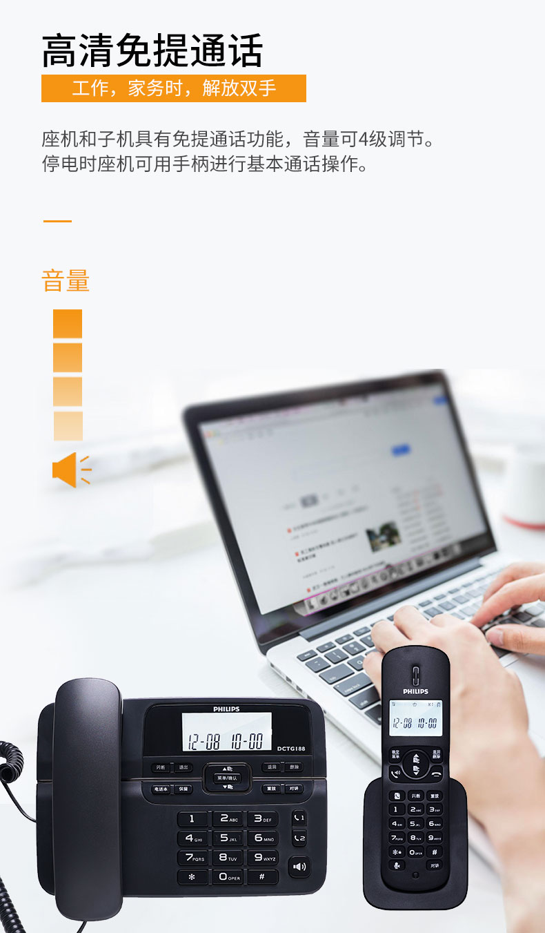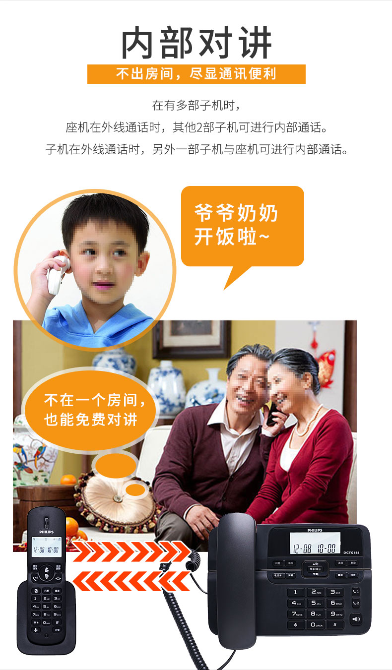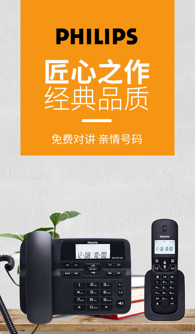 飞利浦 PHILIPS 数字无绳电话机 无线固定座机电话子母机办公家用 一键拨号/电话本 DCTG188一拖一 黑色