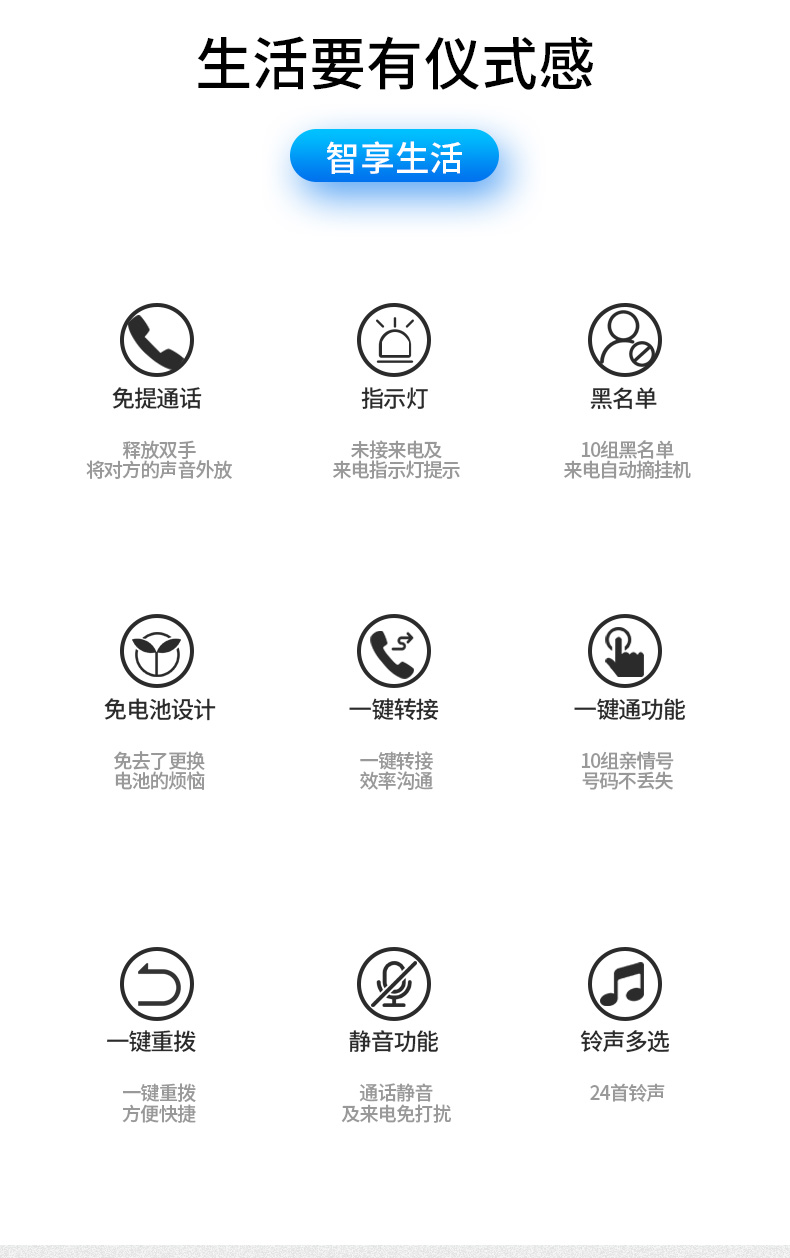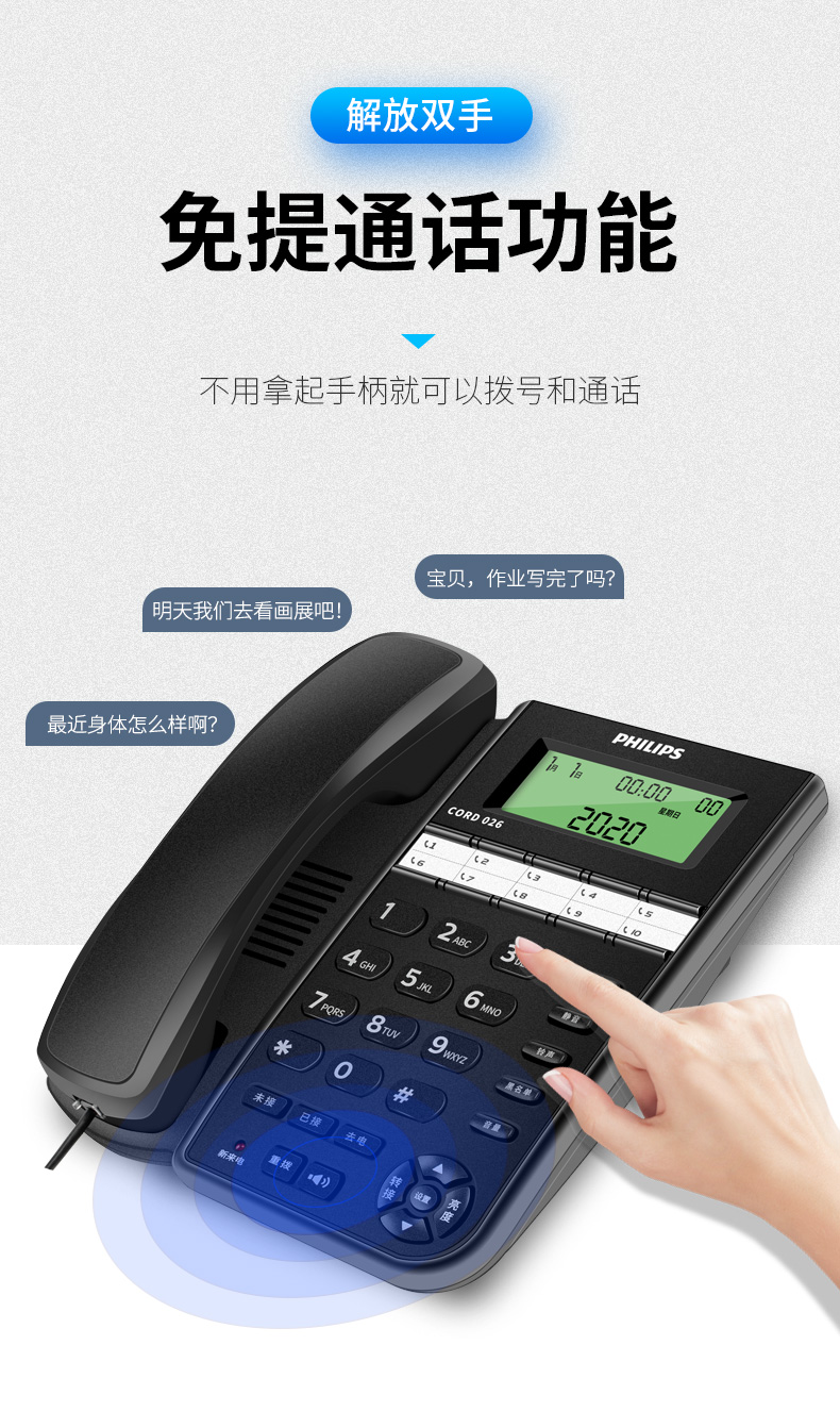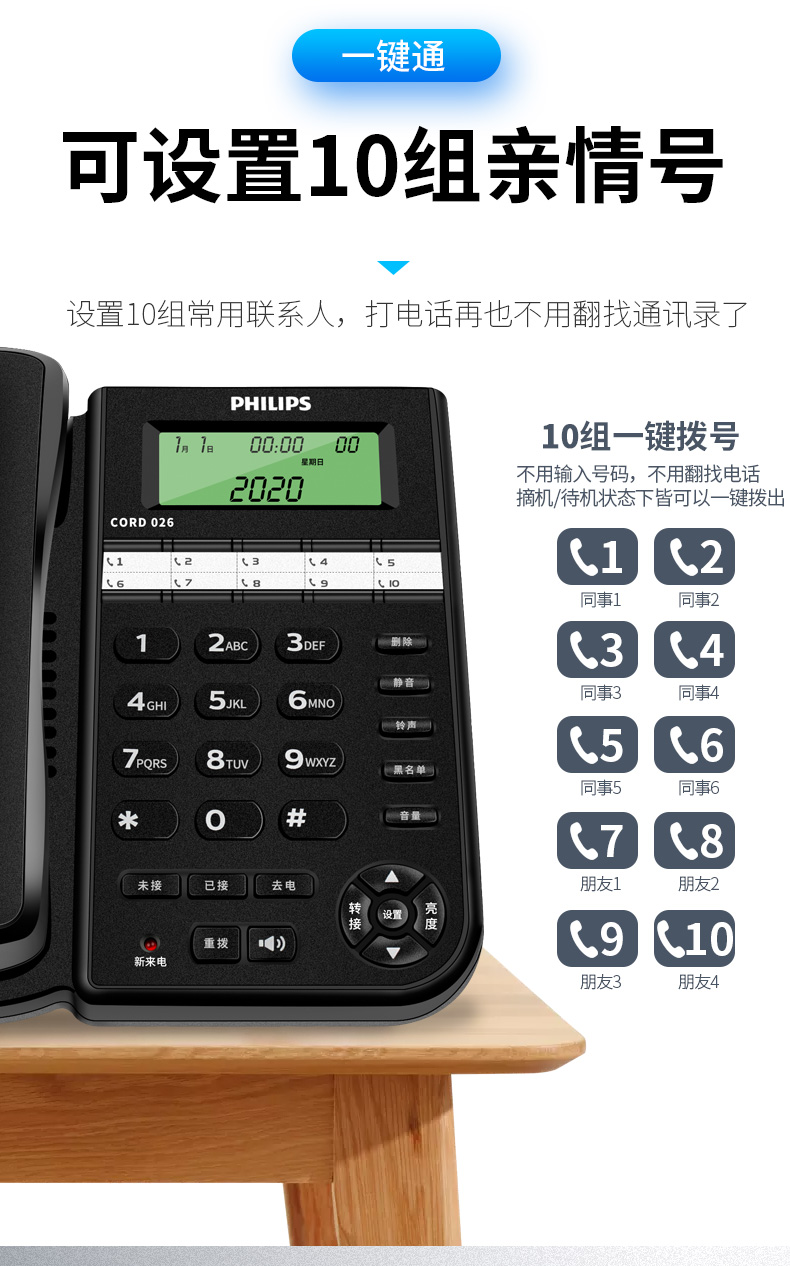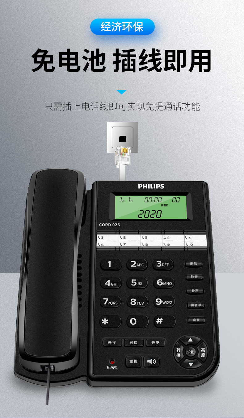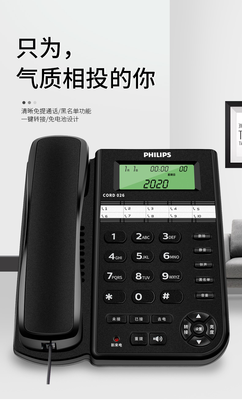 飞利浦(PHILIPS)电话机座机 固定电话 办公家用 10组黑名单/来电指示灯提示 CORD026 黑色