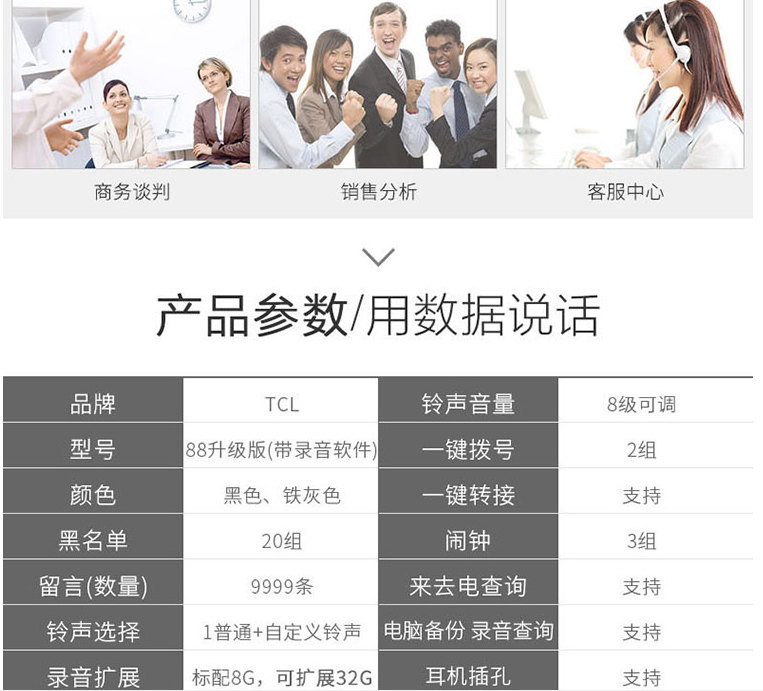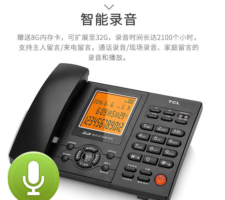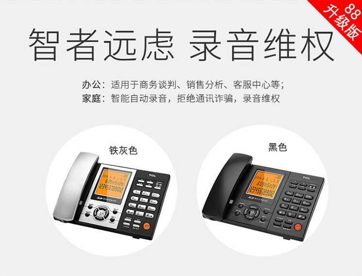 TCL 录音电话机座机 自动/手动录音插卡电话办公呼叫中心固定座机HCD868(88)TSD超级版含耳机(黑色)