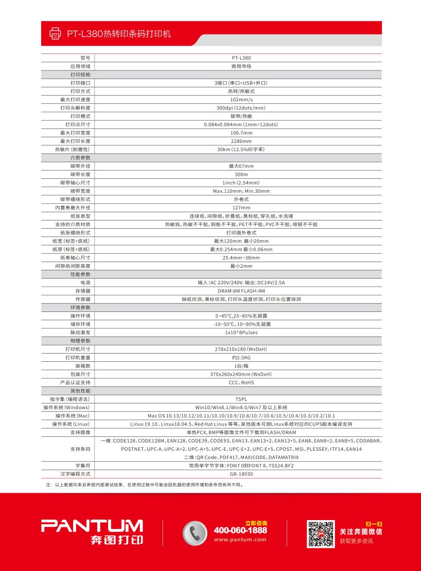 奔图(PANTUM) PT-L380标签机条码打印机(分辨率300DPI/速度127mm每秒)