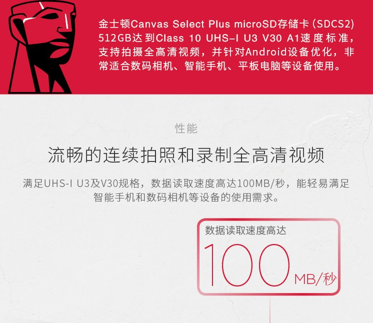 金士顿(Kingston)512GB TF(MicroSD) 存储卡 U3 A1 V30 手机内存卡 读速100MB/s 写速85MB/s