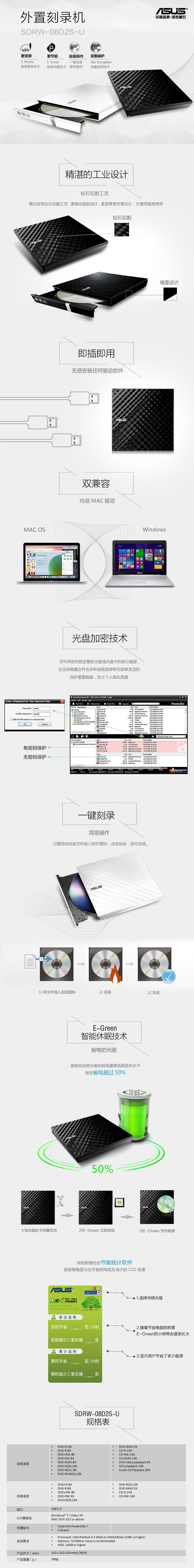 华硕(ASUS) 8倍速 USB2.0 外置DVD刻录机 移动光驱 黑色(兼容苹果系统/SDRW-08D2S-U)