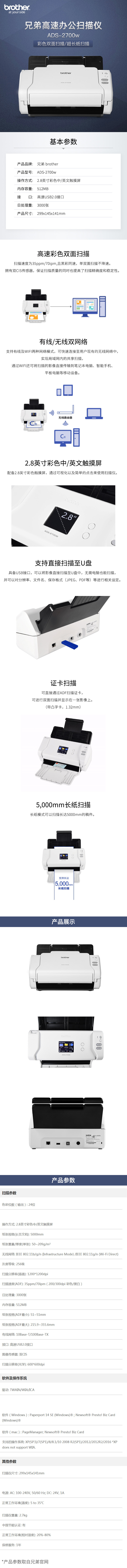 兄弟(brother)ADS-2700W 双面A4馈纸式高清高速扫描仪 无线WIFI有线网络共享 触摸屏U盘可脱机 发票扫描仪