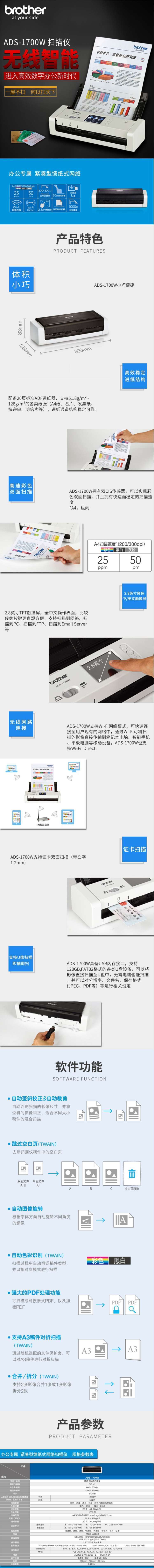 兄弟(brother)ADS-1700W 紧凑型高速双面馈纸式扫描仪 25ppm/50ipm 无线WIFI U盘扫描