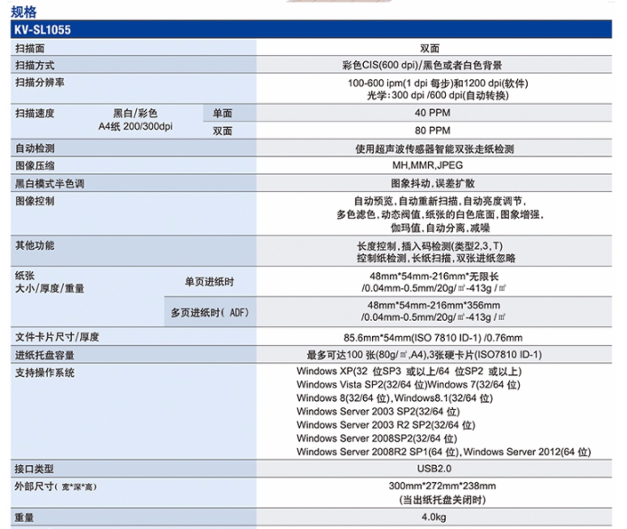 松下(Panasonic)KV-SL1055 高速高清双面自动馈纸A4彩色办公文档扫描仪40PPM 支持银河麒麟系统
