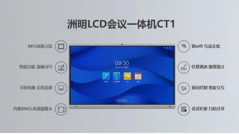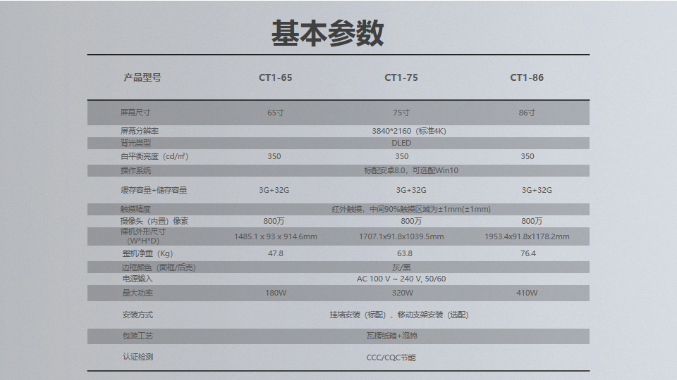 商品属性 [品牌] 洲明 [型号] CT1-86 [节能产品证书编号] CQC21701292264 [参数] 屏幕尺寸:86英寸屏幕分辨率:3840*2160摄像头:800W裸机外形尺寸(W x D x H)mm:1953.4x91.8x1178.2包装尺寸(W x D x H)mm:2135x270x1332净重kg:76.4保修:一年