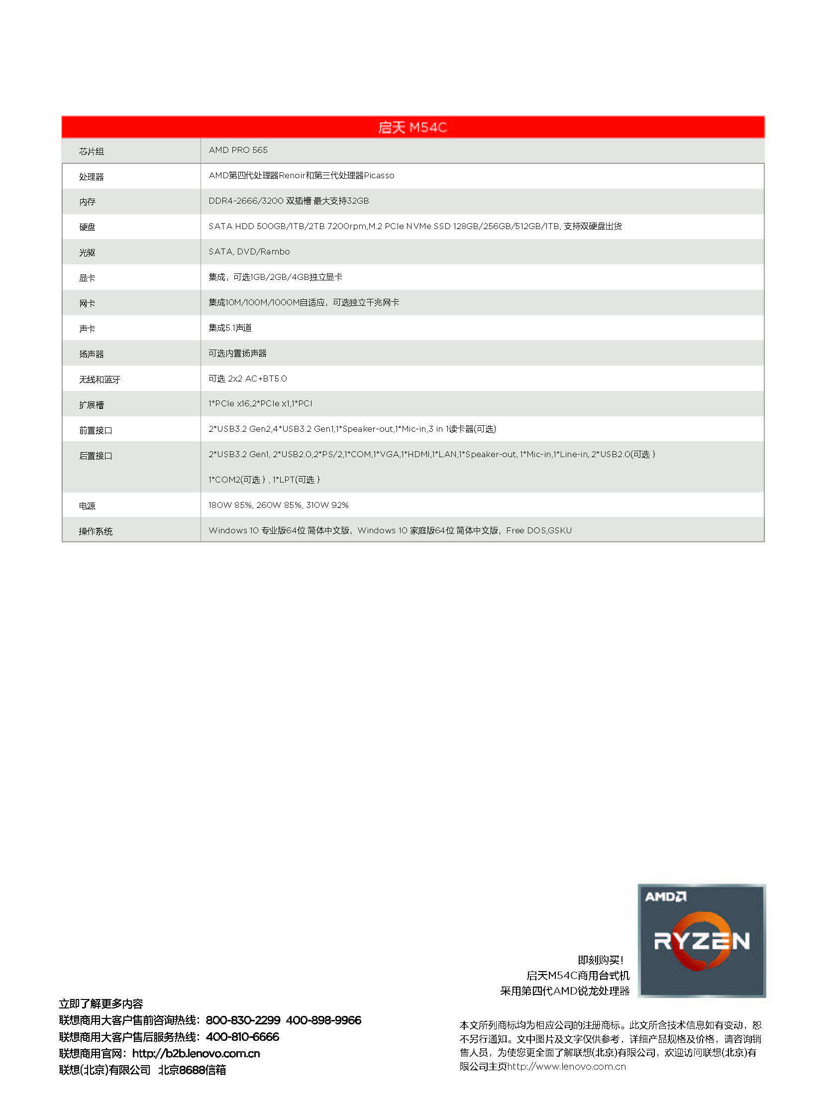 启天M54C-A004:AMD Ryzen3 3200G(四核3.6GHz) /Pro 565主板芯片组 /8GB-DDR4内存 /256GB SSD 硬盘 /无光驱 /180W 85%高能效电源 /PS2键盘 /USB鼠标 /联想智能云教室 /Win10 Home 64bit /三年有限上门保修 /门到桌安装服务