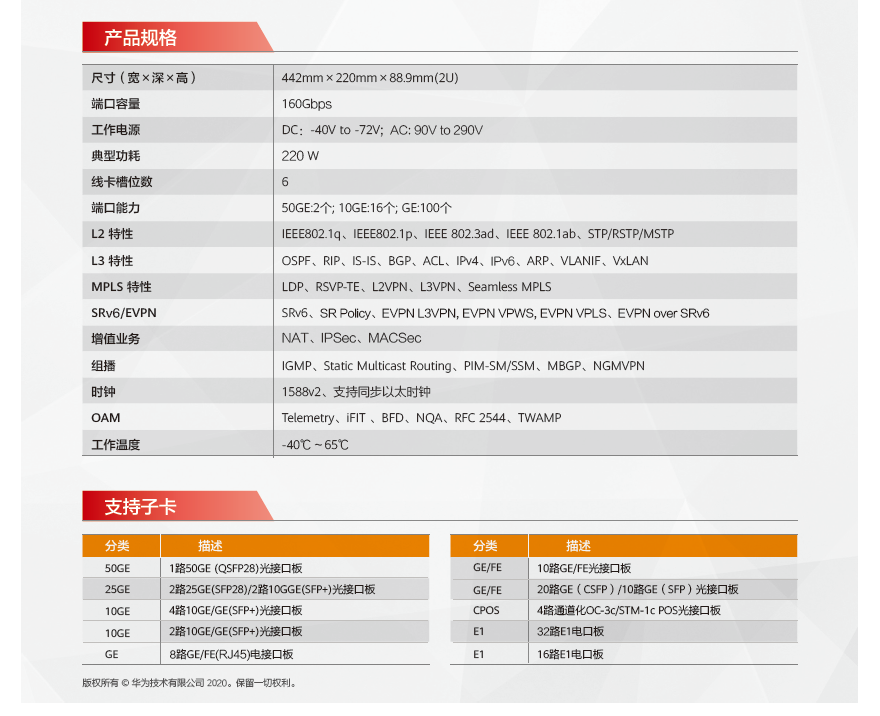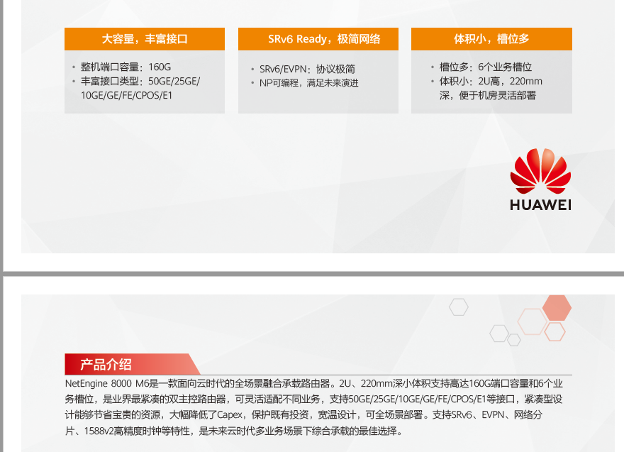 NetEngine 8000 M6机箱/双主控交换板CXPA-160/双直流电源,2块10端口100/1000Base-X-SFP MACsec物理接口卡(PIC);N1-NetEngine 8000 M6 系列高级软件许可证;N1-NetEngine 8000 M6 系列SRv6功能许可证;N1-NetEngine 8000 M6 系列IPSec功能许可证;N1-NetEngine 8000 M6 系列端口分片功能许可证;三年原厂标准保修
