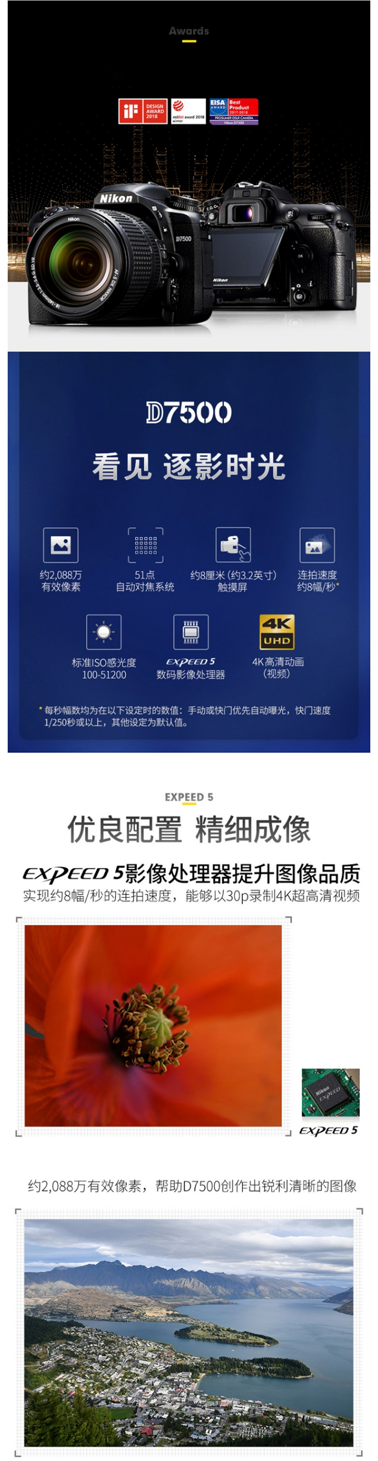 尼康/Nikon 单反套机 D7500 2088万像素 18-140mm镜头 闪迪256GSD卡 尼康原装相机包/电池/三脚架云台套装/清洁套装