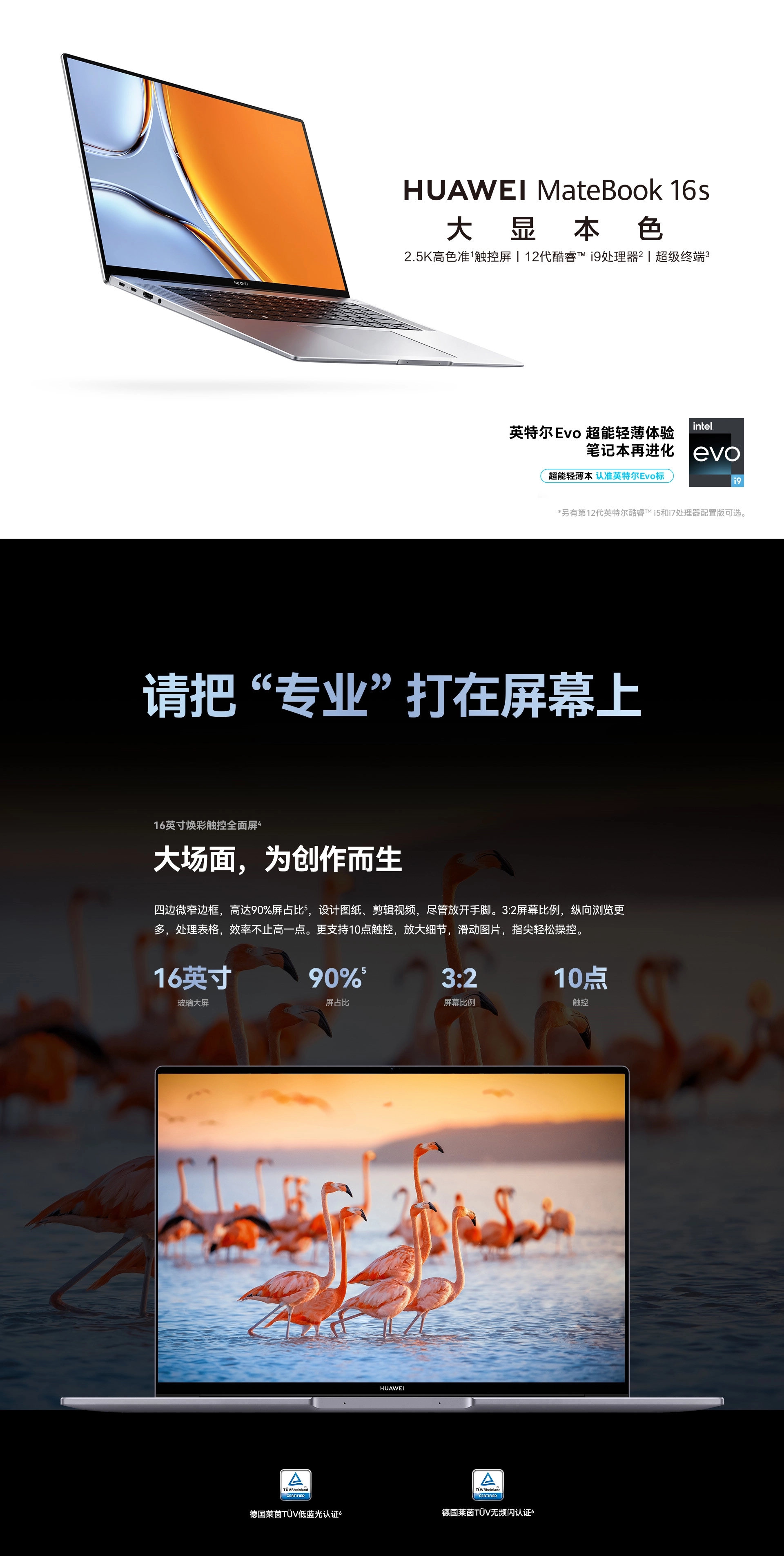 华为笔记本电脑MateBook 16s 英特尔EVO 16英寸 12代酷睿标压i7 16G 512G锐炬显卡/轻薄本/2.5K触控全面屏 灰