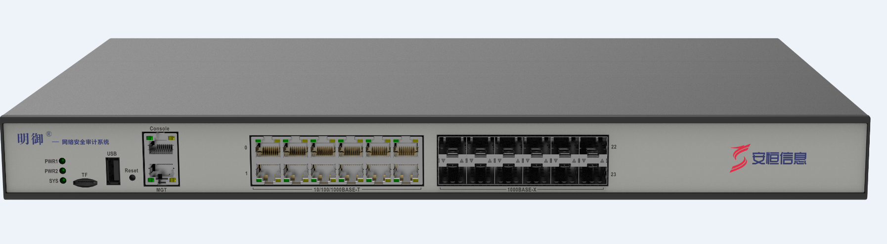 安恒信息 DAS-AC-950 硬件尺寸:标准1U硬件平台、网口类型:12*GE电口,12*SFP光口、接口扩展槽:无、硬盘:2TB HDD、电源配置:双交流电源