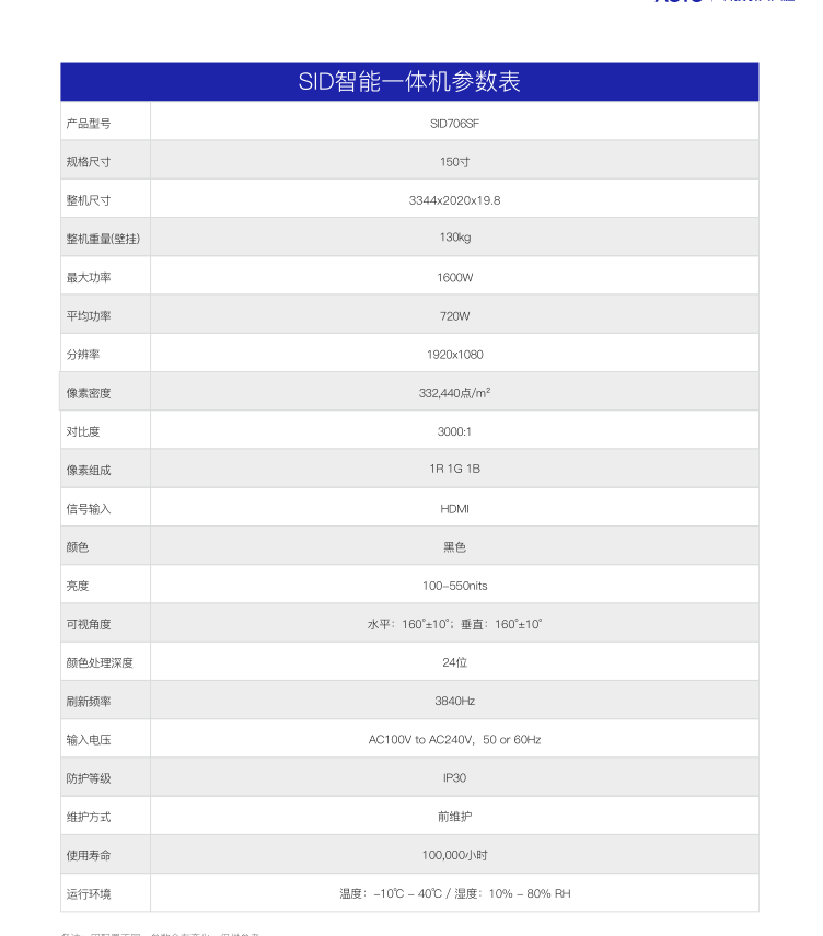 AOTO奥拓/SID706SF 150寸LED显示屏(含落地支架、备用模组、备用扫描卡、有线维护工具、会议高清摄像机、采集卡 、无线全向麦克风 、辅材)
