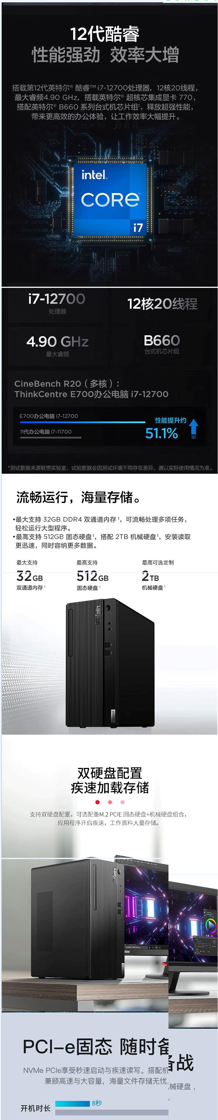 联想ThinkCentre E700工作站I7-12700CPU,内存32G,双1T机械硬盘+512SSD固态硬盘, -WIN11 系统,电源 260w ,office2021 USB KM 串口 集显 无WIF 3L+3内置扬声器、23.8液晶显示器含键鼠
